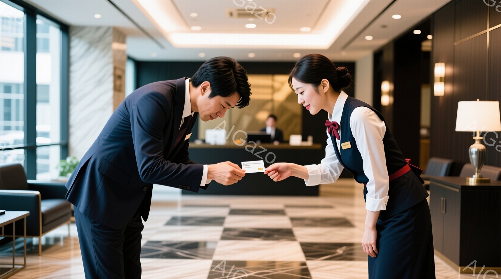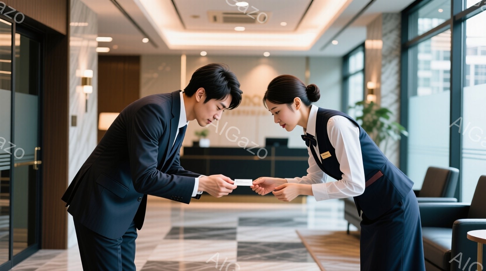 この無料AI生成画像「男性客と女性接客員が会話をする中で、お土産のお小遣いを交換します。男性は単色のスーツに髪型はショートカット、表情は警戒しています。女性接客員は専用制服を着用、お土産を渡しています。周囲は閉じた空間であり、高級ホテルのロビーに見られるようなインテリアが楽しめます。」は、2025年10月26日に作成されました。 サイズは 1664×928px の高解像度で、商用利用も可能なフリー素材として提供しています。