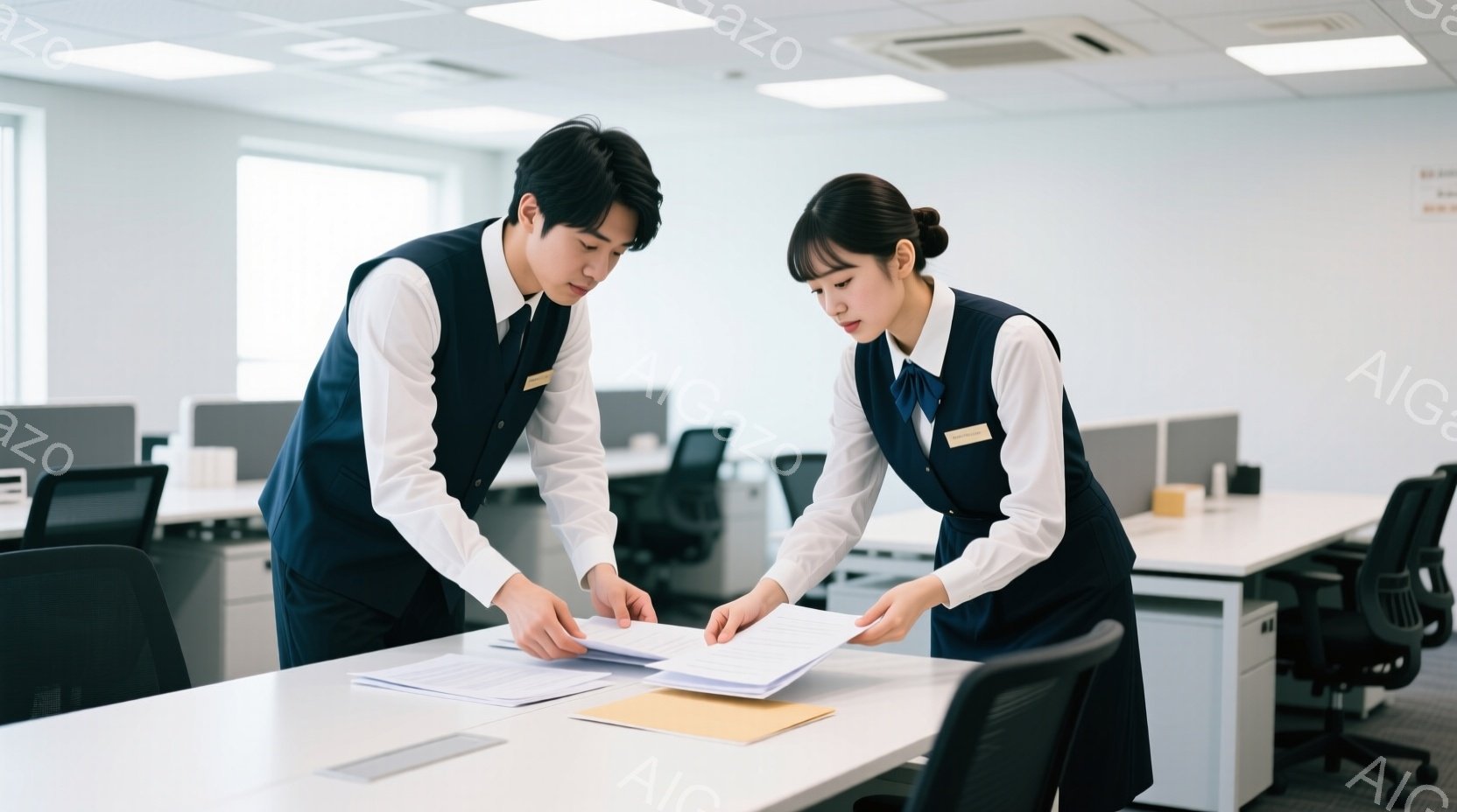 オフィスで、若い男女が書類を見ながら話し合っている様子が写っている。二人は紺色のベストと白いシャツ、黒いパンツまたはスカートを着用しており、身だしなみが整っている。明るい室内には白を基調としたデスクが並び、全体的に清潔で落ち着いた雰囲気が漂っている。