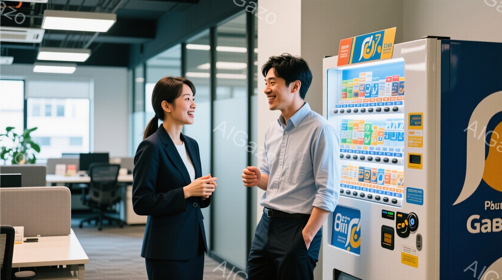 オフィス内にいる若い女性と男性が、自動販売機の前で会話を楽しんでいる様子が写っている。女性は黒いジャケットと白いシャツを着ており、髪は肩にかかる長さで、笑顔を見せている。男性は白いシャツを着ており、片手をポケットに入れ、リラックスした姿勢で女性と話している。