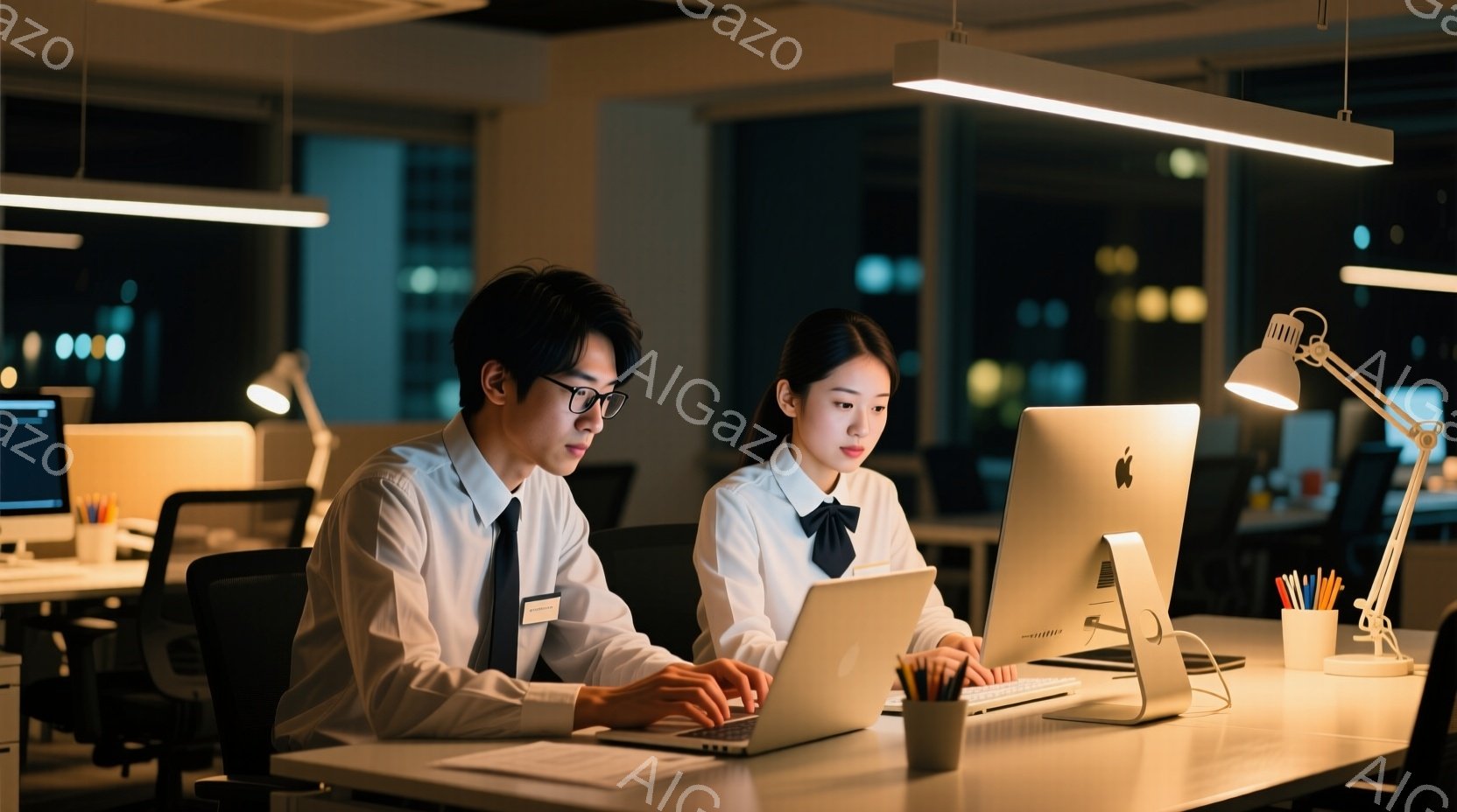 職場と思われるオフィスで、若いビジネスマンと女性がパソコンに向かっています。ビジネスマンは白いシャツにネクタイ、女性は黒いジャケットと白いシャツ姿で、真剣な表情で作業に集中しています。背景には他のデスクやオフィス機器が見え、室内は落ち着いた雰囲気で、夜間の仕事風景を彷彿とさせます。