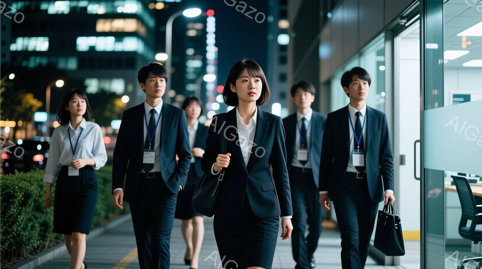 三人のビジネスパーソンが夜の街を歩いている。彼らは皆、黒いスーツに白いシャツ、ネクタイ、そして身分証のようなものを首から下げている。表情は真剣で、前方を向いて歩いている様子から、仕事終わりや重要な会議に向かう途中であることが推測できる。