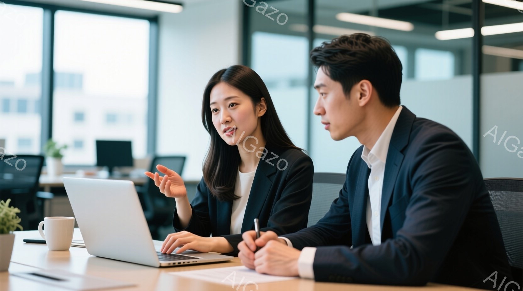 職場と思われるオフィスで、一人の女性と一人の男性がノートパソコンを囲んで座っています。女性は黒いジャケットを着ており、髪は長くストレートで、何かを説明するように手を広げています。男性はスーツを着ており、真剣な表情でパソコン画面を見つめています。