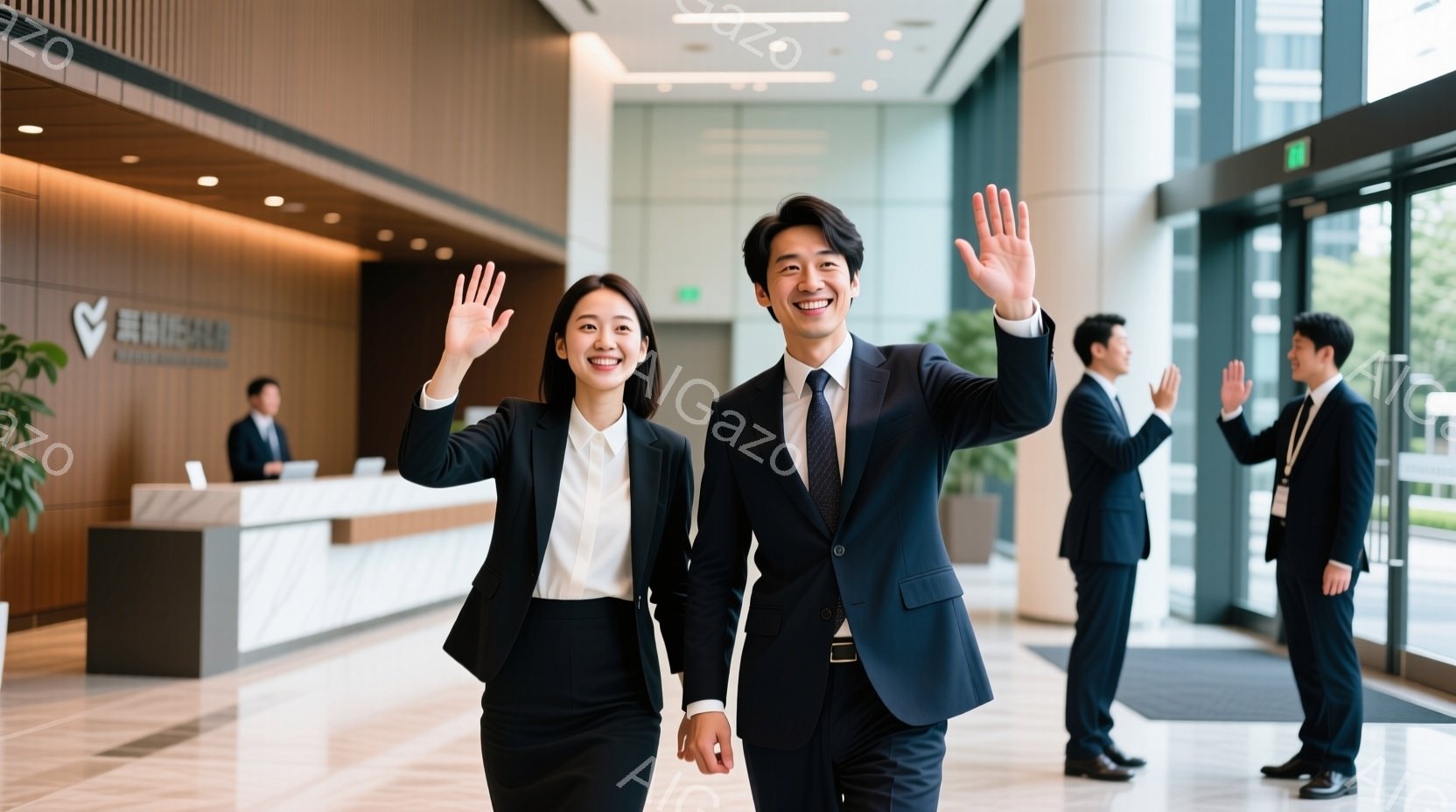 ビジネススーツを着た若い男女が、明るい笑顔でカメラに向かって手を振っています。背景には受付カウンターと、黒いスーツを着た他の人々が見え、近代的なオフィスビルのロビーのようです。全体的に、歓迎的でプロフェッショナルな雰囲気が漂っています。
