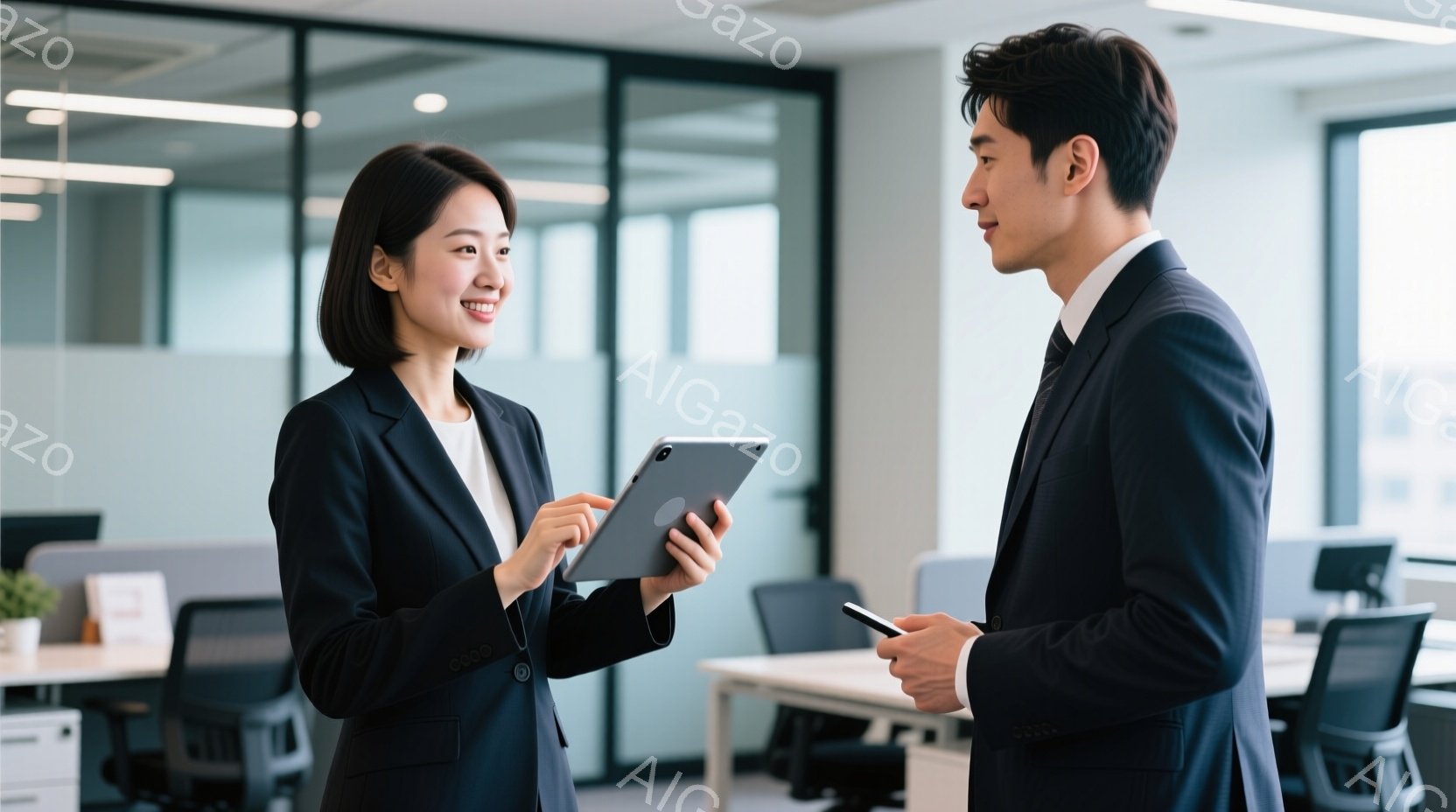 この無料AI生成画像「紺色のスーツを着た若い男女が、白い会議テーブルを挟んで向き合って座り、ノートに何か書き込んでいる。男性は黒髪で、少し前かがみの姿勢でペンを握り、女性は髪を後ろで束ねており、真剣な表情でペンを走らせている。背景はガラス張りの壁で、オフィスらしき空間が広がっており、全体的に落ち着いた雰囲気である。」は、2025年10月26日に作成されました。 サイズは 1664×928px の高解像度で、商用利用も可能なフリー素材として提供しています。