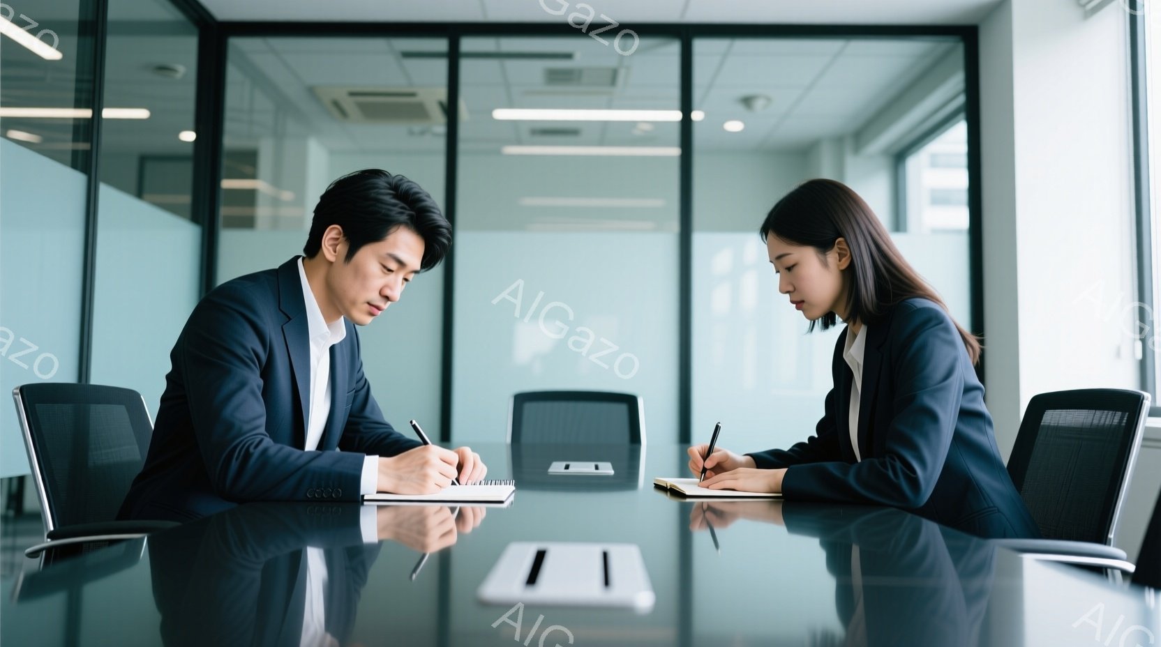 紺色のスーツを着た若い男女が、白い会議テーブルを挟んで向き合って座り、ノートに何か書き込んでいる。男性は黒髪で、少し前かがみの姿勢でペンを握り、女性は髪を後ろで束ねており、真剣な表情でペンを走らせている。背景はガラス張りの壁で、オフィスらしき空間が広がっており、全体的に落ち着いた雰囲気である。