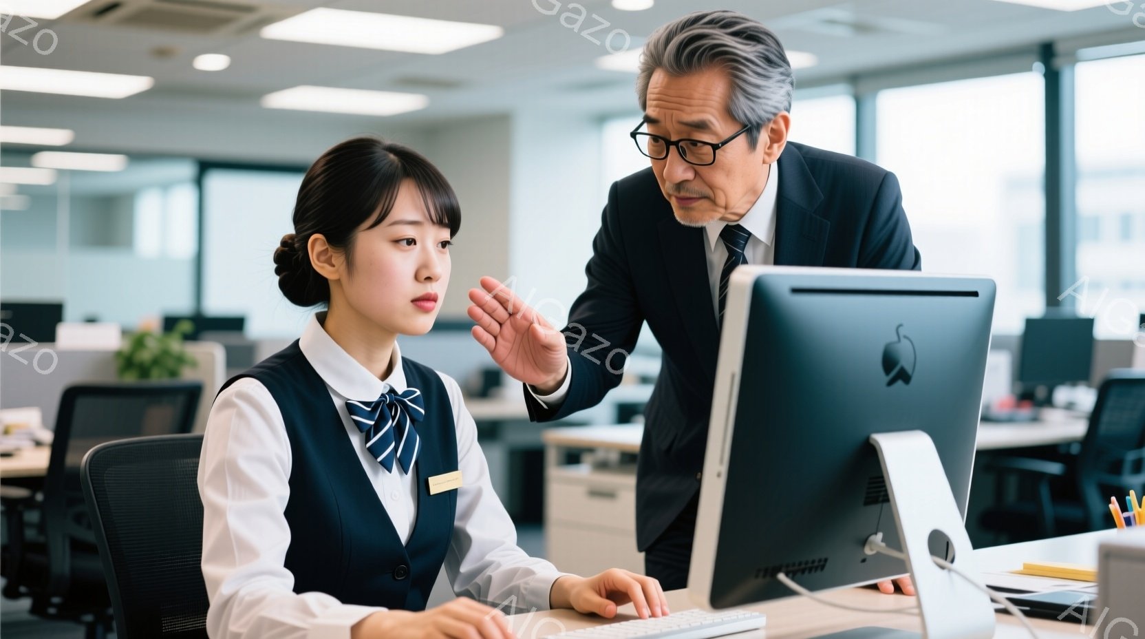 若い女性がコンピューターに向かって座っており、青いジャケットとネクタイのシャツを着ています。彼女は少し緊張した表情で画面を見つめ、指をキーボードに置いている。年配の男性が彼女の肩越しに画面を見ながら何かを説明しており、彼の表情は真剣で、指導している様子が伺えます。