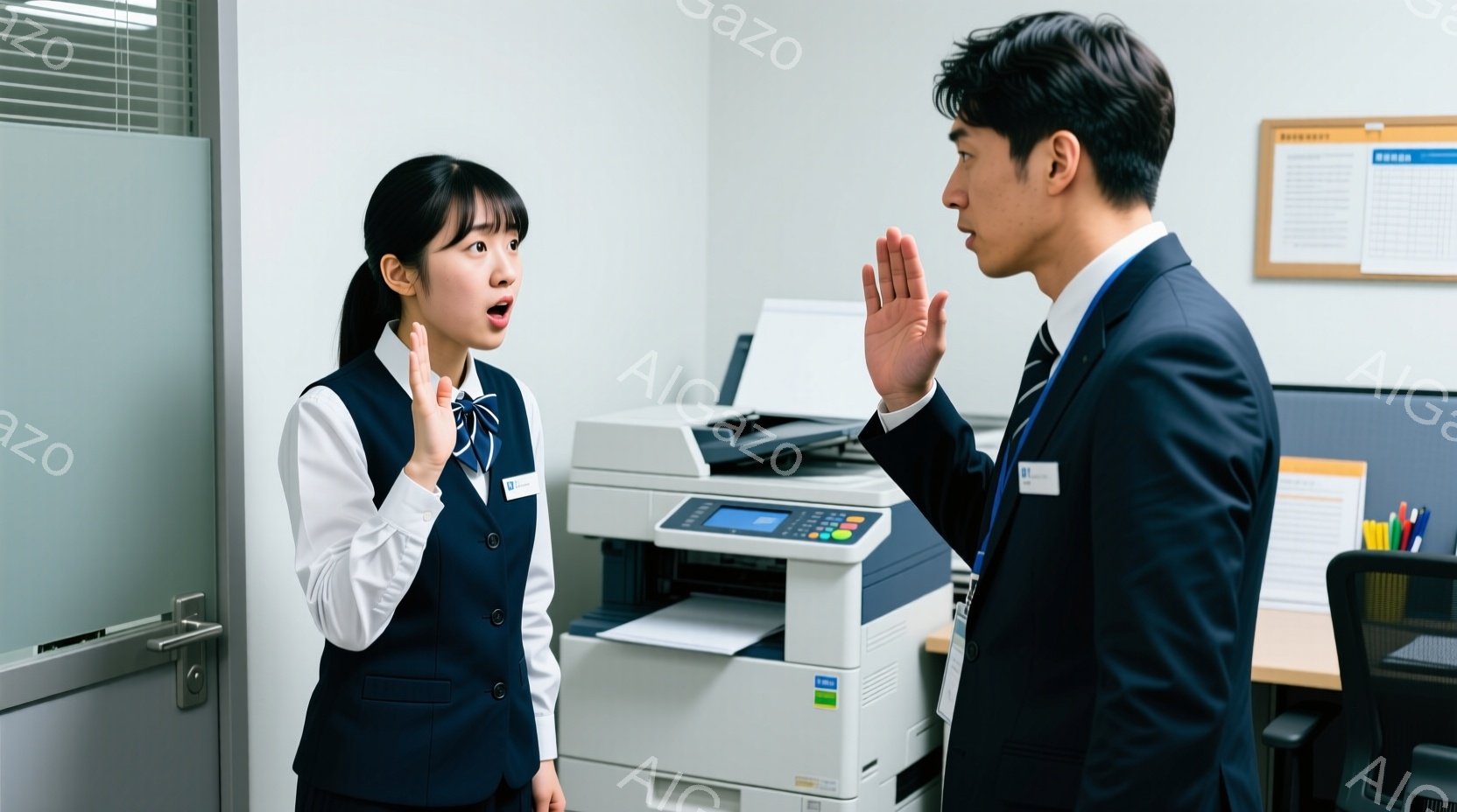 オフィスでコピー機を前にした若い女性と男性が写っています。女性はネイビーのベストと白いブラウス、スカート姿で、驚いた表情で両手を上げています。男性はスーツを着て、女性に向かって手を広げ、何かを制止しているような仕草をしています。
