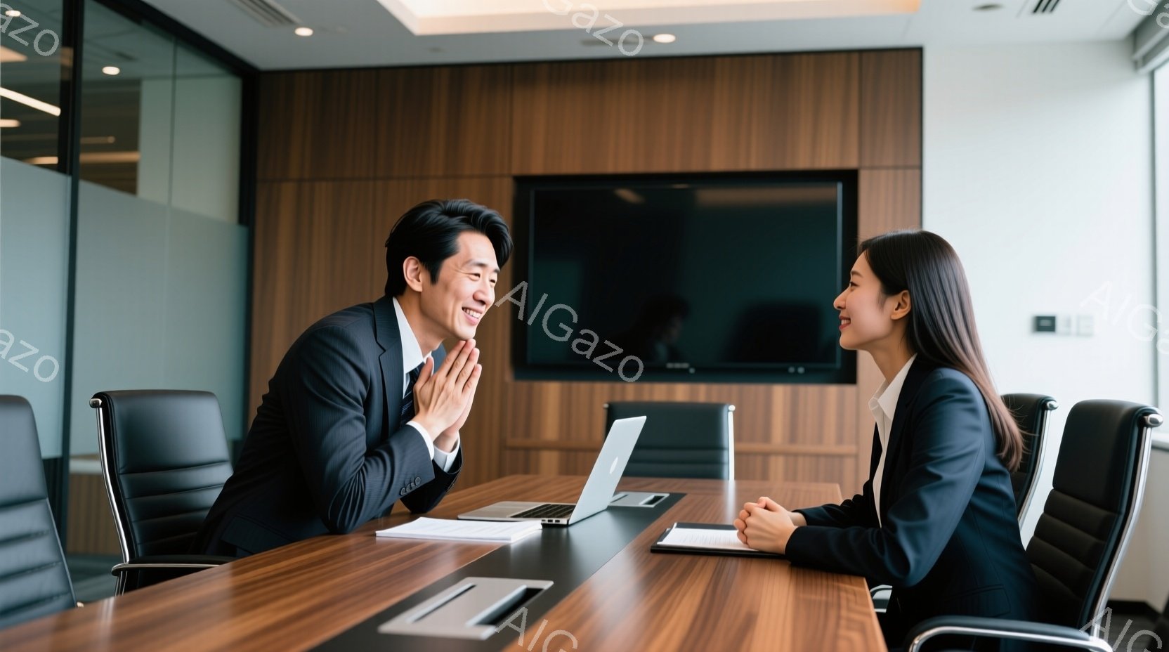 会議室で、男性はスーツを着て、両手を頬に当てて笑顔で何かを祝っているように見えます。女性もスーツを着ており、穏やかな表情で男性を見つめています。背景には木目調の壁と大きな画面があり、室内は明るく清潔感があり、和やかな雰囲気が漂っています。
