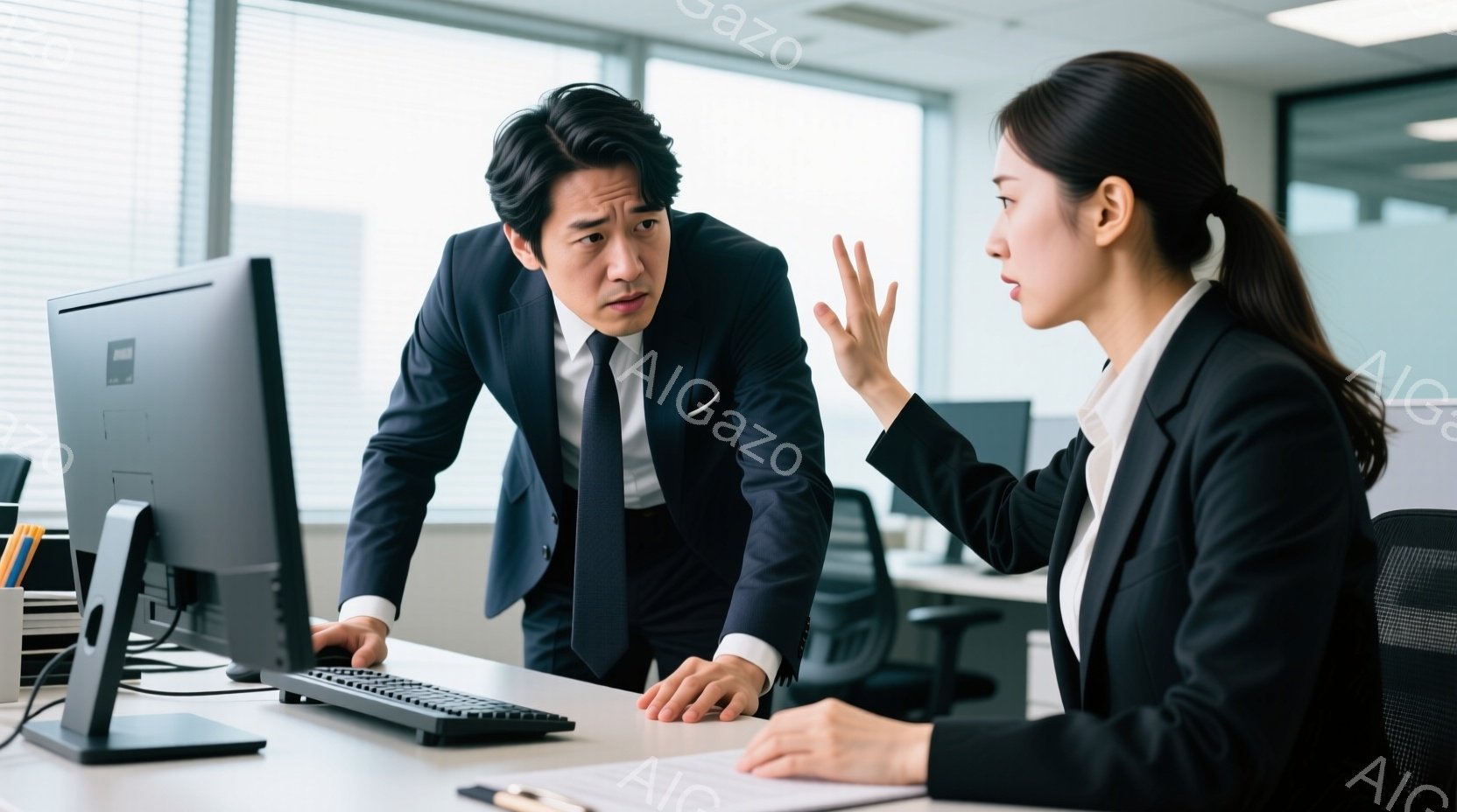 ビジネススーツを着た男女が交差点で会話している様子が写っている。女性は黒髪で、左手にバッグを持ち、男性は右手を上げて何かを説明しているようだ。背景には高層ビルが立ち並び、多くの人が歩いていることから、賑やかな都会の風景であることがわかる。
