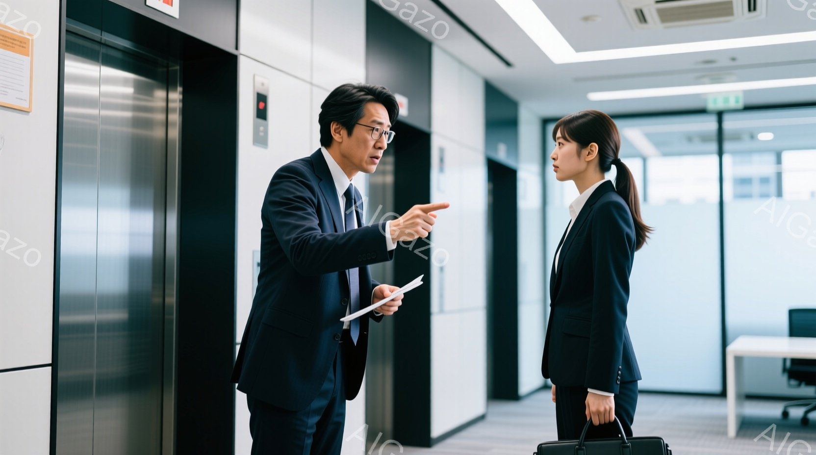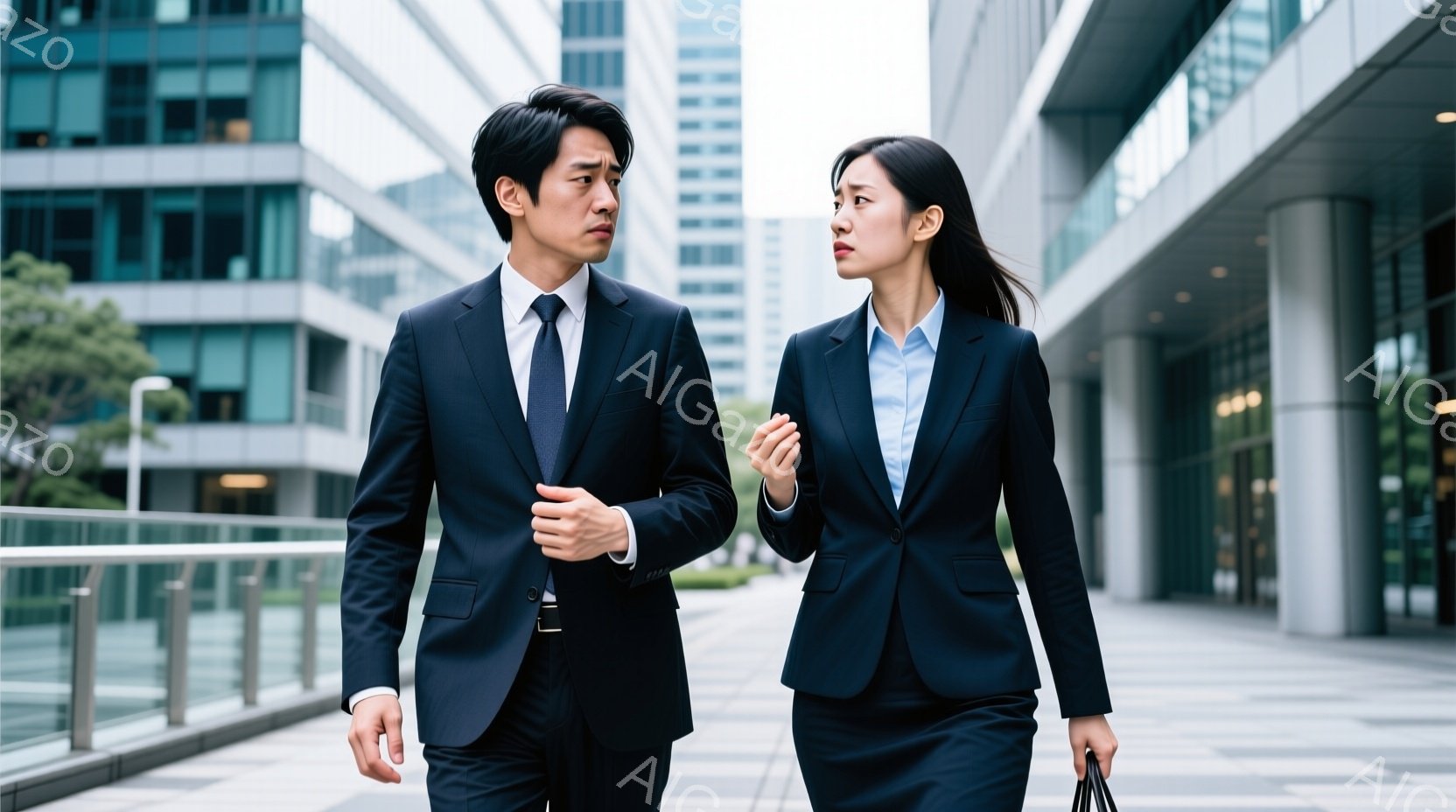 ビジネススーツを着た男女が写っている。男性は黒いスーツにネクタイを締め、女性は黒いスーツに白いインナーを合わせている。二人は少し険しい表情で、互いの視線を合わせず、前方を向いて歩いている。