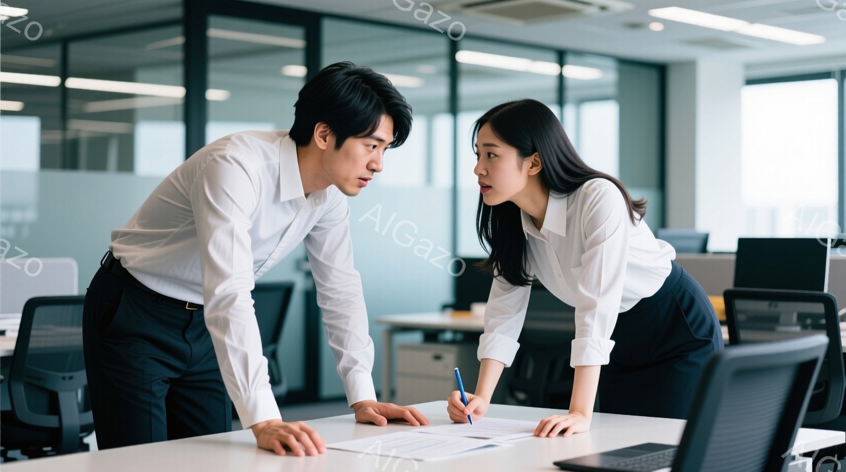 ビジネスシーンの室内で、男性と女性が書類を前にかがんで確認しています。男性は紺色のスーツにネクタイ、女性は白いブラウスに黒いスカートを着用し、真剣な表情で書類を指し示しています。背景にはオフィス内のデスクやパソコンがぼやけて見え、集中して仕事に取り組む雰囲気が伝わってきます。