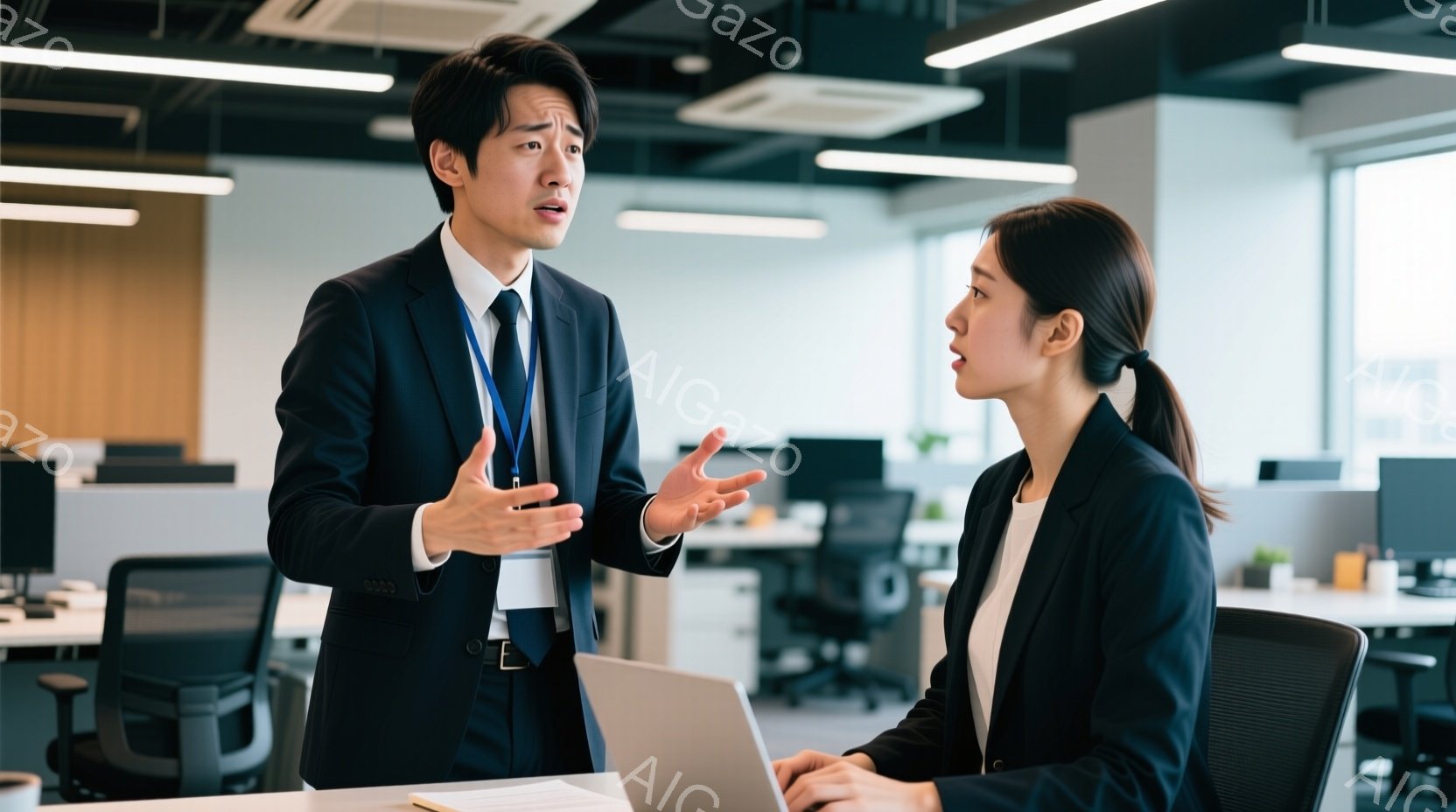 ビジネスマンが片手を広げ、何かを説明している様子で、女性は彼に注意深く耳を傾けている。オフィス内は白を基調としたモダンなデザインで、多くのデスクと観葉植物が見え、全体的に明るい雰囲気である。女性は黒髪のポニーテールで、真剣な表情でパソコンを見つめている。