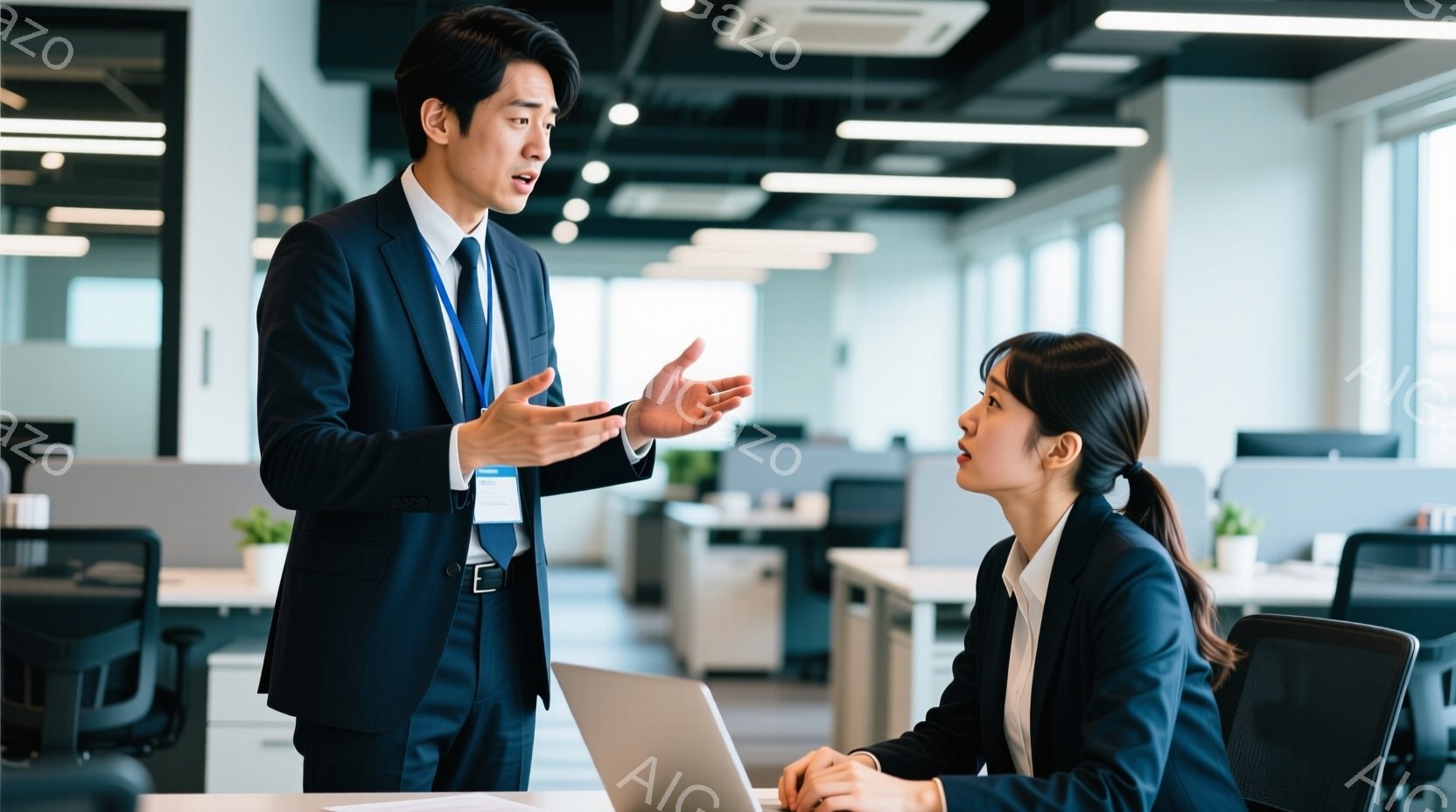 この無料AI生成画像「スーツ姿の男性が、驚いた表情の女性に対して何かを説明している様子が写っている。男性は片手を広げ、熱心に話しており、女性は椅子に座り、少し口を開けて彼を見つめている。オフィス内には複数のデスクが並び、窓からは自然光が差し込み、現代的で活気のある雰囲気が漂っている。」は、2025年10月26日に作成されました。 サイズは 1664×928px の高解像度で、商用利用も可能なフリー素材として提供しています。