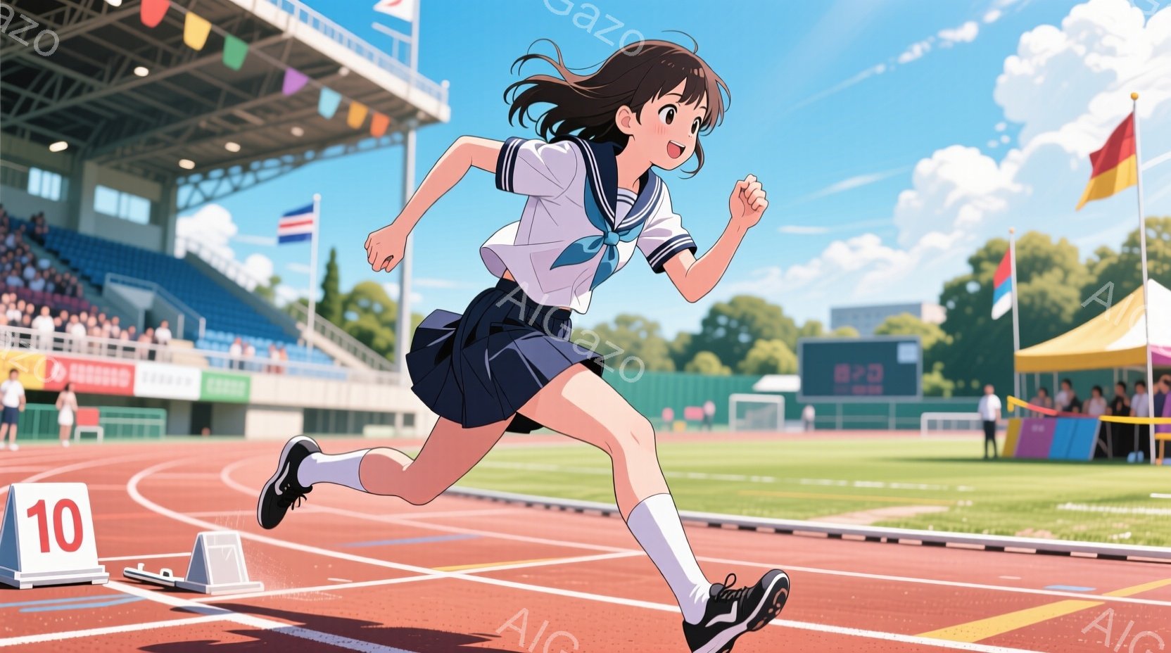 制服姿の少女が、陸上競技場のトラックを走っている様子が描かれています。彼女は、白いシャツに濃い青色のスカート、そして白いソックスと黒いスニーカーを着用し、髪はポニーテールに結ばれています。背景には、観客席やトラック、そして青空と白い雲が広がり、活気に満ちた競技場の雰囲気が伝わってきます。