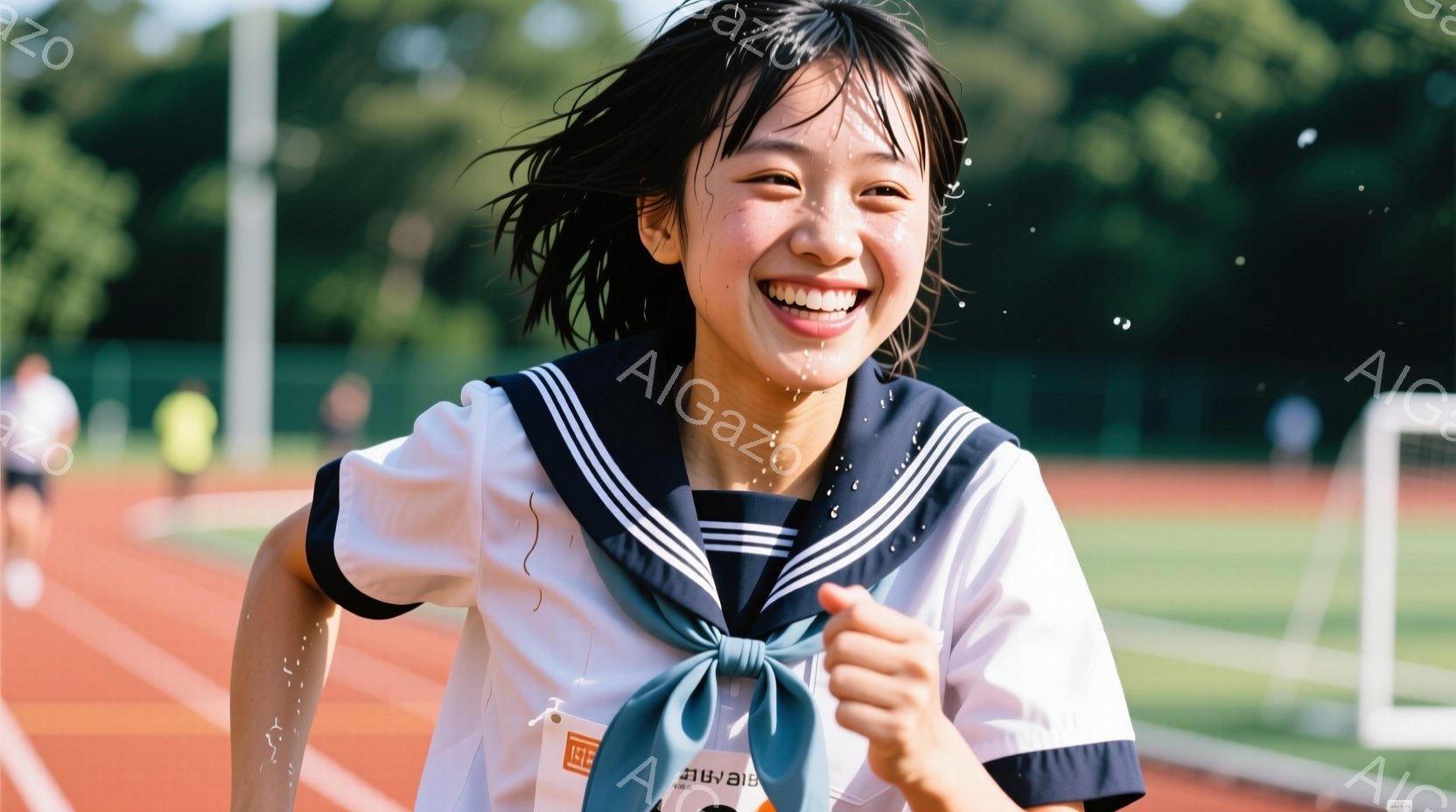 この無料AI生成画像「明るい晴れた日に、若い女性が陸上競技場で走り幅跳びをしている様子が写っている。彼女は白とネイビーのトラックアンドフィールドユニフォームを着ており、髪はポニーテールに結ばれている。彼女は空中で体を前に伸ばし、砂場に飛び込む直前のダイナミックな姿勢をとっており、周囲には観客席やコーン、テントなどが確認できる。」は、2025年10月26日に作成されました。 サイズは 1664×928px の高解像度で、商用利用も可能なフリー素材として提供しています。
