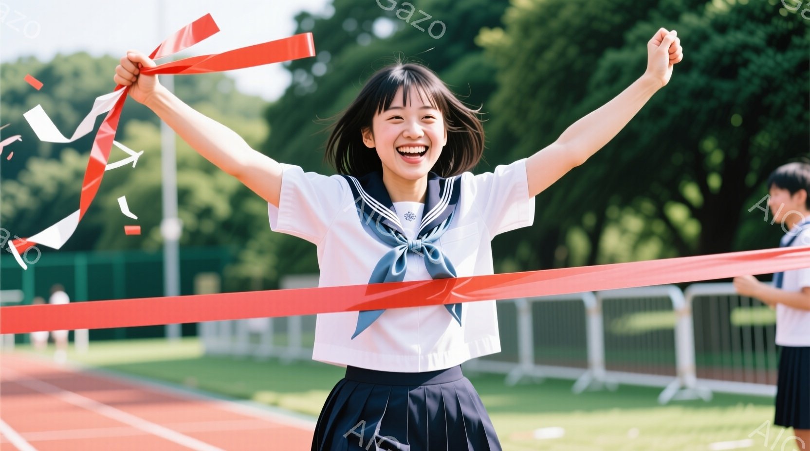 制服を着た女子高生が、競技会のフィニッシュラインを切る瞬間を捉えた写真です。彼女は両手を高く上げ、満面の笑みを浮かべ、勝利の喜びを表現しています。背景には緑の芝生と他の生徒たちが写っており、晴天の下、活気あふれる運動会のような雰囲気が伝わってきます。