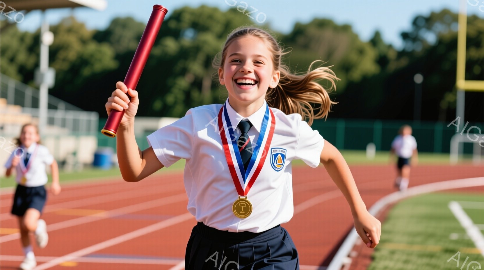 少女は競技場で走っており、顔には満面の笑みが浮かんでいます。彼女は白いシャツに紺色のスカート、そして金色のメダルを首にかけており、髪はポニーテールに結ばれています。背景には観客席や緑の木々が見え、晴れた空の下、活気のある競技場の雰囲気が伝わってきます。