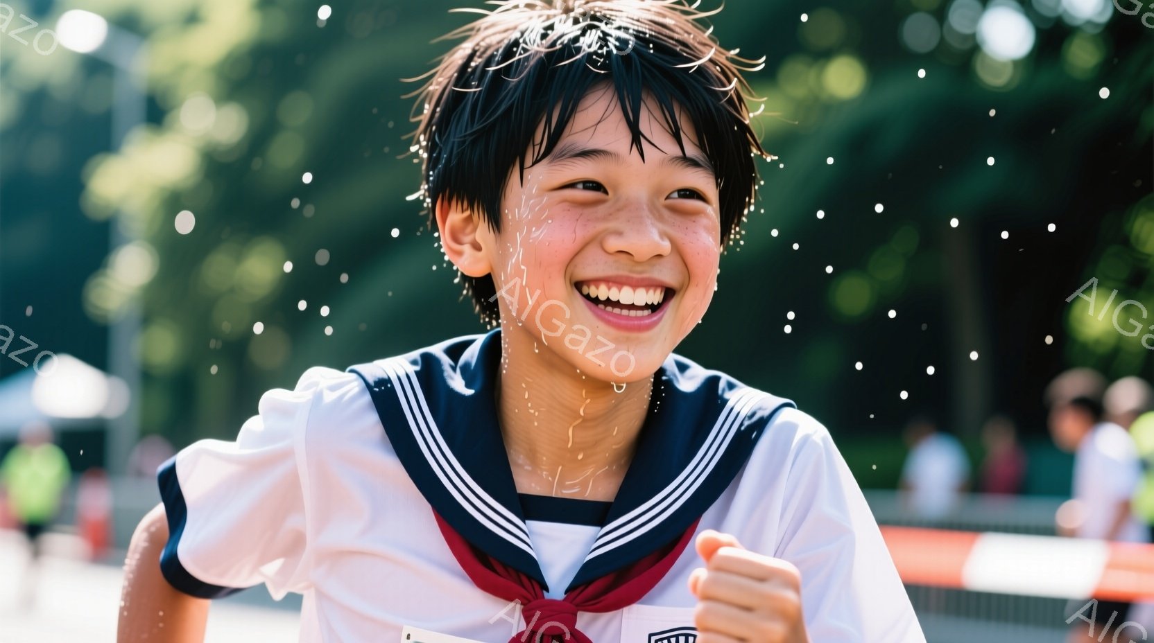 制服姿の少年が、真っ赤なリボンを握り、満面の笑顔でこちらを見ている。髪は濡れており、額には汗が光っていることから、運動後であると推測できる。背景には緑豊かな木々と、赤いトラックの一部が見え、晴天の下での活気ある情景が広がっている。