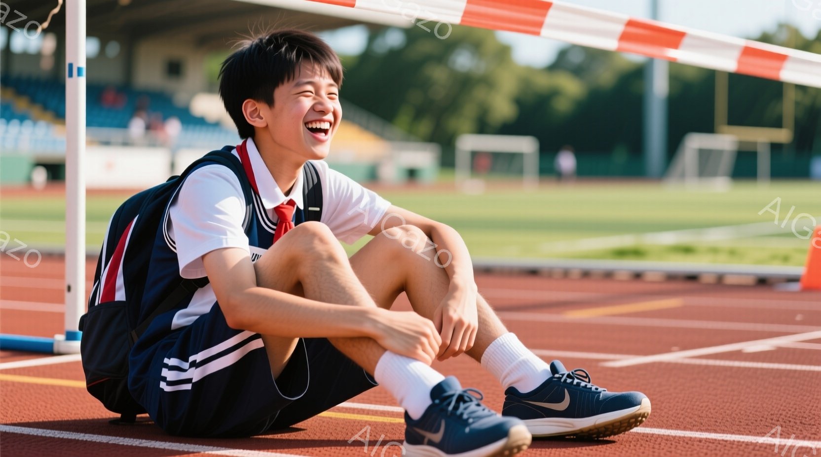 少年は陸上競技場のトラックに座り込み、大きく笑っている。紺色のバックパックを背負い、白と紺のストライプのシャツと短パン姿で、白い靴下とスニーカーを履いている。背景には緑の芝生と観客席、そして晴天の空が見え、明るく活気のある雰囲気である。