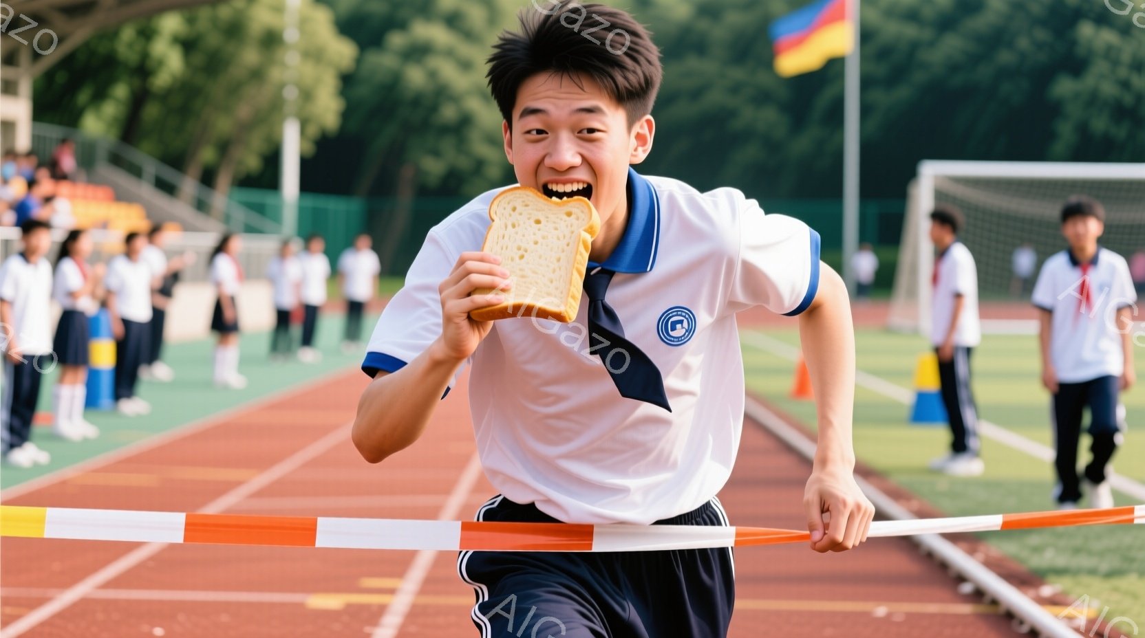 少年は競技場で金メダルを首にかけて満面の笑みを浮かべている。白いポロシャツに黒いジャケットを羽織り、茶色の髪を無造作にとかしている。背景にはトラック、ゴールネット、そして夕焼け空が広がり、勝利と希望に満ちた雰囲気を醸し出している。