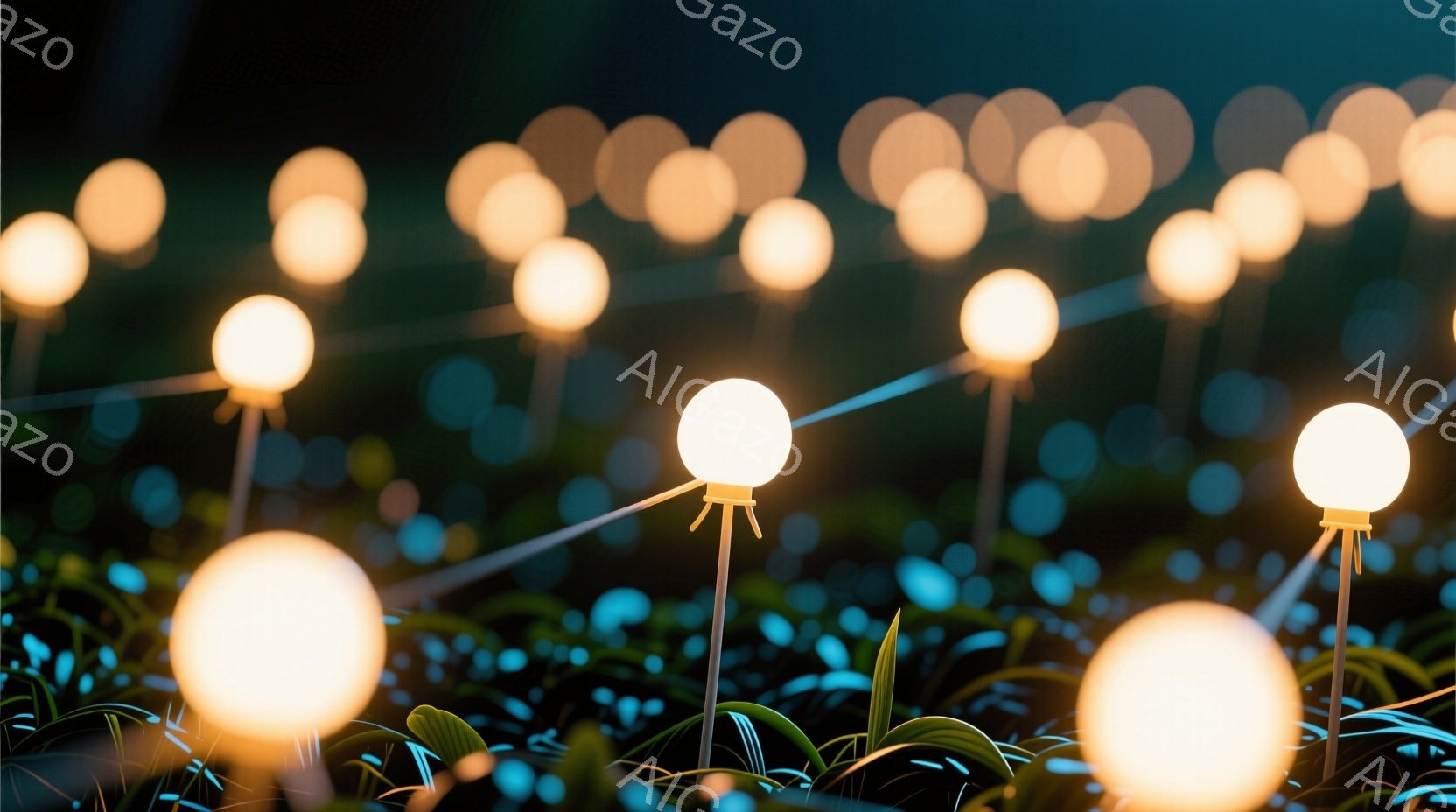 多くの光る球体が緑色の低い草の上に散らばっており、幻想的な光景を作り出している。球体は暖かく柔らかな光を放ち、周囲の暗闇の中でぼんやりと輝いている。背景は暗く、球体からの光が草のテクスチャを強調し、穏やかで夢幻的な雰囲気を醸し出している。