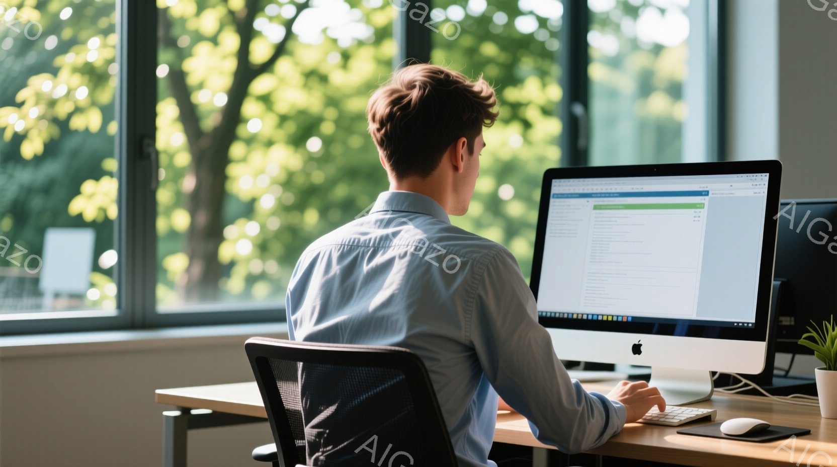 白いシャツを着た男性が、コンピューターの画面を見つめています。彼は椅子に座っており、画面にはグラフやデータが表示されています。背景にはオフィスの一部が見え、観葉植物が置かれており、全体的に落ち着いた雰囲気です。