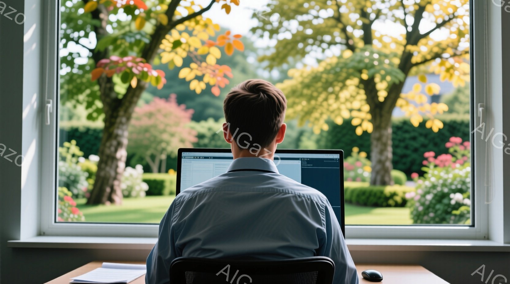 白いシャツを着た男性が、窓を背にしてコンピュータに向かっています。彼は黒い椅子に座り、背筋を伸ばした姿勢で、画面上のコードを見つめています。背景には緑豊かな庭園が広がり、晴れた空と木々が穏やかな雰囲気を醸し出しています。