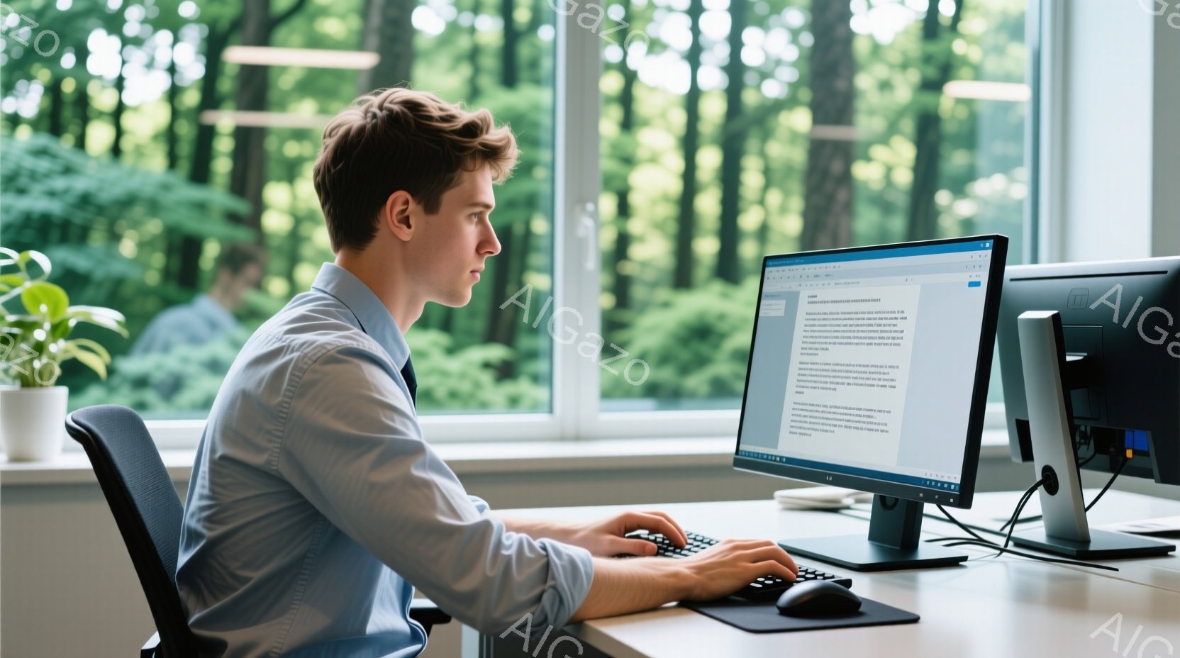 若い男性が白いシャツにネクタイ姿で、コンピュータの前に座ってキーボードを操作している。彼は集中した表情で、姿勢はまっすぐで、窓の外には緑豊かな森が見える。オフィス内は明るく、落ち着いた雰囲気で、自然光が差し込んでいる。