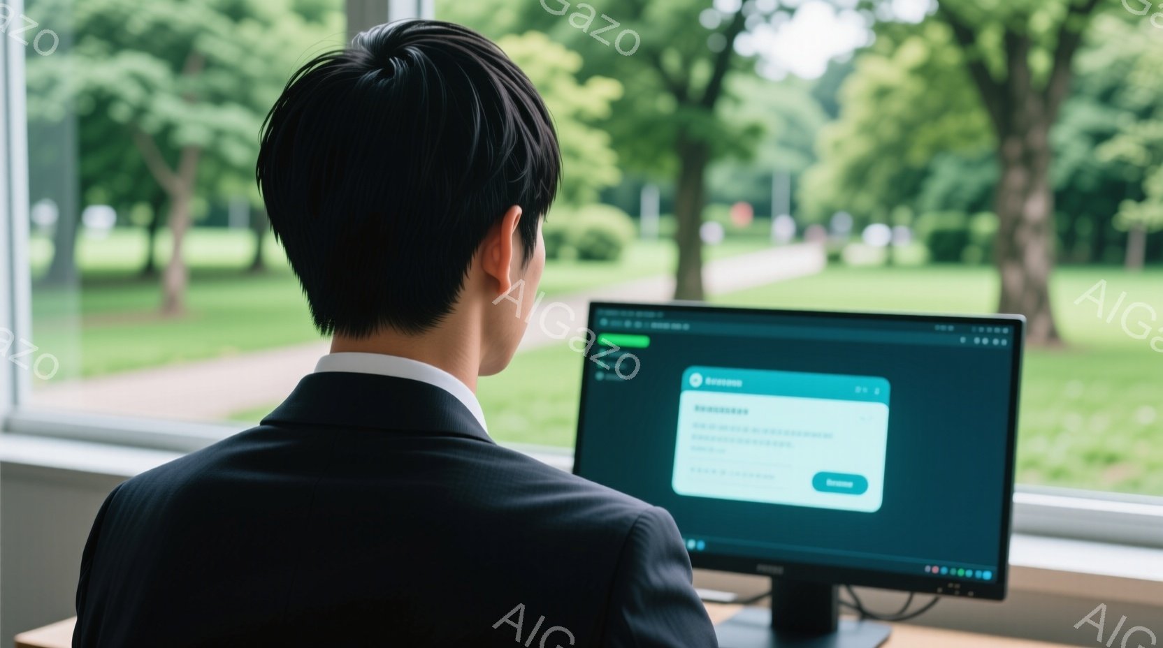 黒いスーツを着た男性がパソコンに向かって座っており、画面には「Observe AI」と書かれたインターフェースが表示されています。彼は後ろ姿で、髪は短く整えられており、窓の外には緑豊かな公園と晴れた空が広がっています。 全体的に、集中して仕事に取り組む姿勢が感じられる、静かで落ち着いた雰囲気の画像です。