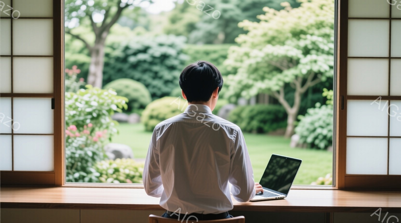 白いシャツを着た男性がオフィスでパソコンに向かって作業している。彼は黒髪で、真剣な表情でキーボードを叩いている。背景には緑豊かな木々が見え、オフィスは明るく開放的な雰囲気である。