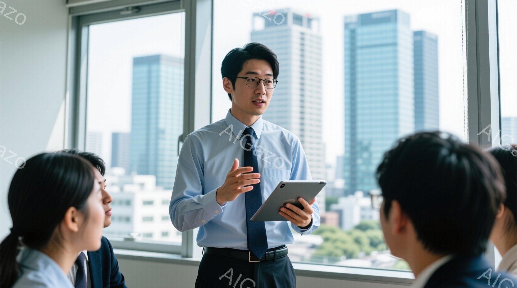 若いビジネスマンがタブレットを手に、同僚たちに向けて何かを説明している様子が写っている。彼は白いシャツにネクタイ、濃い色のズボンという服装で、姿勢は立っており、表情は真剣で自信に満ちている。背景には高層ビル群が広がり、晴天で明るい室内、ビジネスシーンの活気を感じさせる。