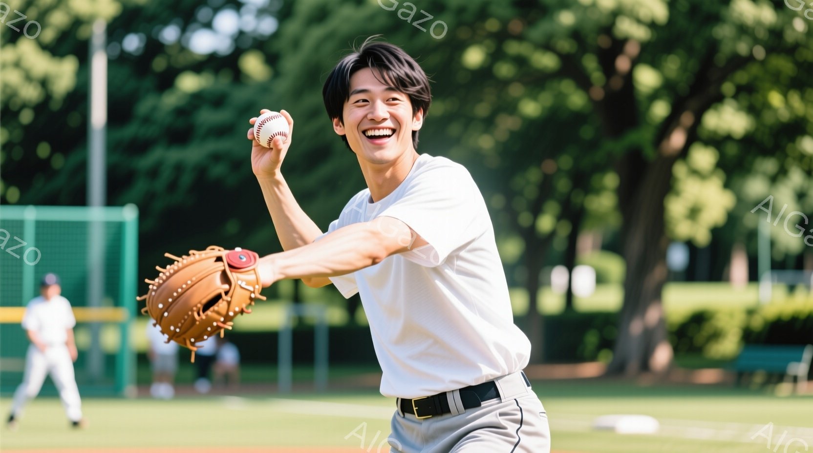 若い男性が野球の準備をしている様子が写っている。白いTシャツとグレーのズボンを着用し、笑顔でボールを投げようとしている。背景には緑豊かな芝生と木々、そして野球のネットとベースがあり、晴れた日の屋外での活動を連想させる。