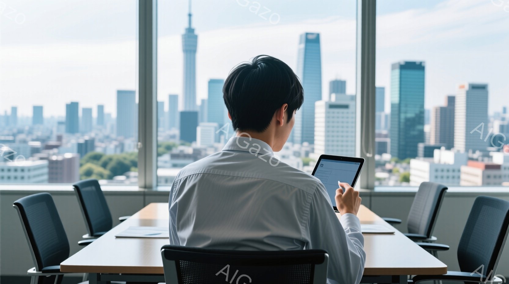 白いシャツにサスペンダーを付けた男性が、窓際に置かれた長い木製の会議テーブルに向かって座り、タブレット端末を見ている。背景には高層ビル群が広がる大都市の景色が広がっており、晴天の下、遠くには緑が見える。全体的に落ち着いた雰囲気で、ビジネスシーンにおける思考や意思決定の場面を連想させる。