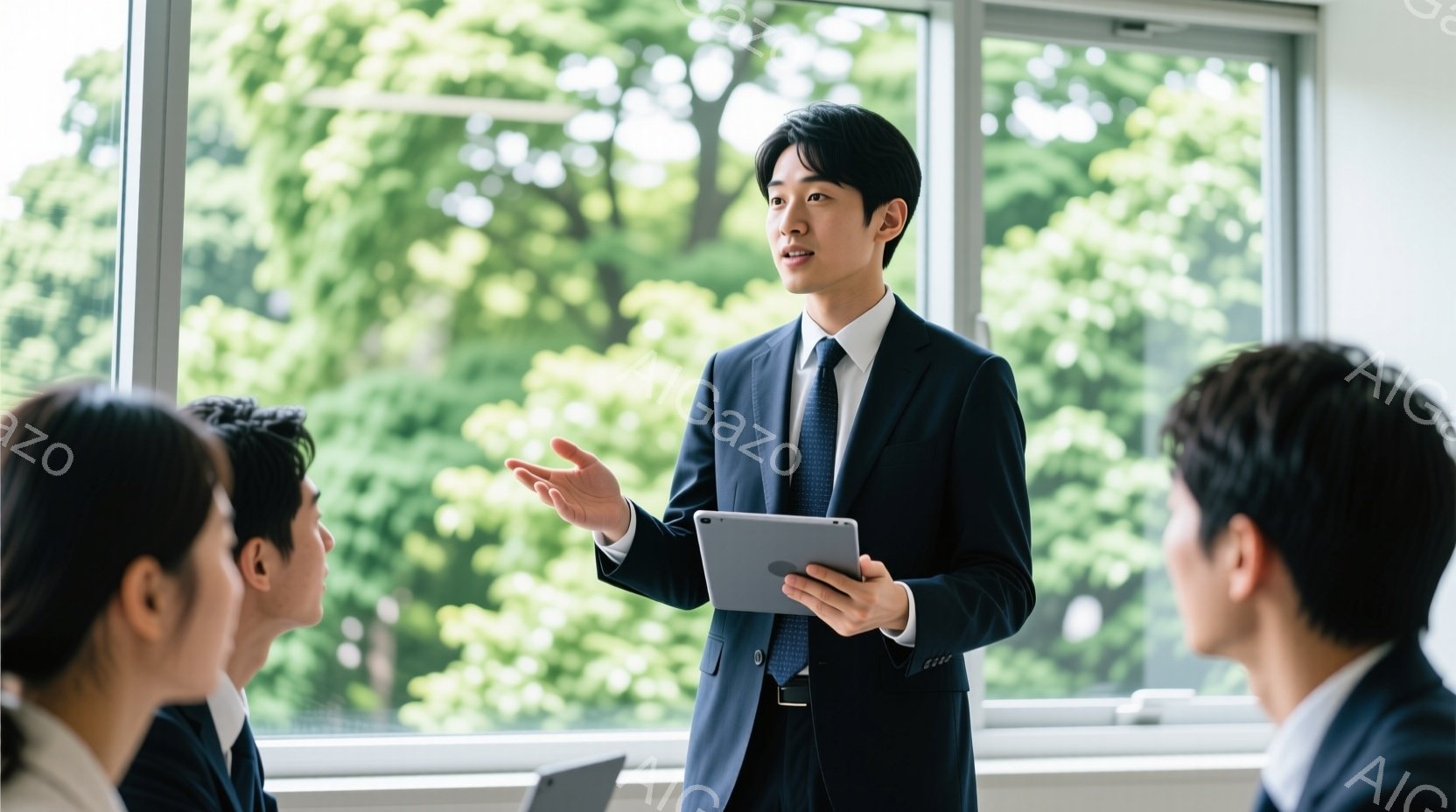 紺色のスーツにネクタイを締めた男性が、タブレットを手にしながらプレゼンテーションをしている様子が写っている。彼は少し体を前に傾け、片手を広げて説明しており、真剣な表情をしている。背景には大きな窓があり、緑豊かな木々が見え、室内は明るく、活気のある雰囲気である。