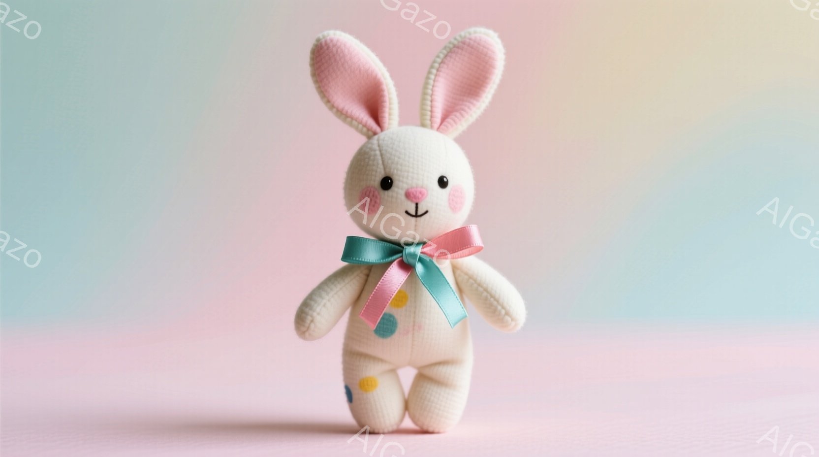 ふわふわのピンクのリボンをつけた白いウサギのぬいぐるみです。つぶらな瞳と小さな鼻で、愛らしい表情をしています。背景は淡いピンク色で、様々な色の小さな花とハートの形が散りばめられ、春らしい、優しい雰囲気を醸し出しています。