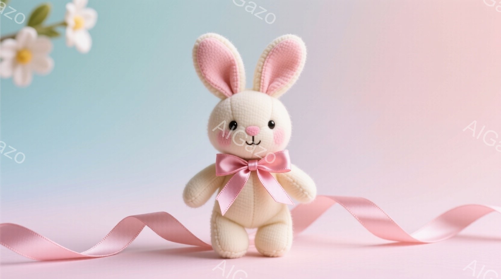 柔らかいピンク色の背景に、愛らしいぬいぐるみのウサギが立っています。ウサギはクリーム色のボディに、緑色のハート模様が散りばめられ、ピンクのリボンを首に巻いています。その表情は穏やかで、全体的に暖かく優しい雰囲気です。