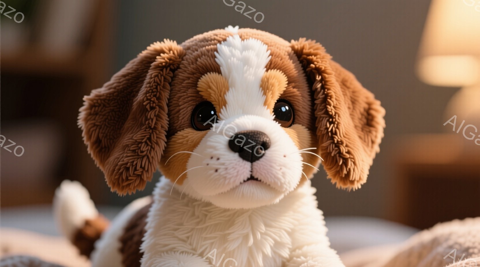 白と茶色のふわふわした子犬のぬいぐるみは、柔らかいカーペットの上にうつ伏せで横たわっています。つぶらな瞳と小さな鼻が愛らしい表情を作り出し、安心感と温かさを感じさせます。背景はぼやけており、焦点は完全に子犬の愛らしさに向けられています。