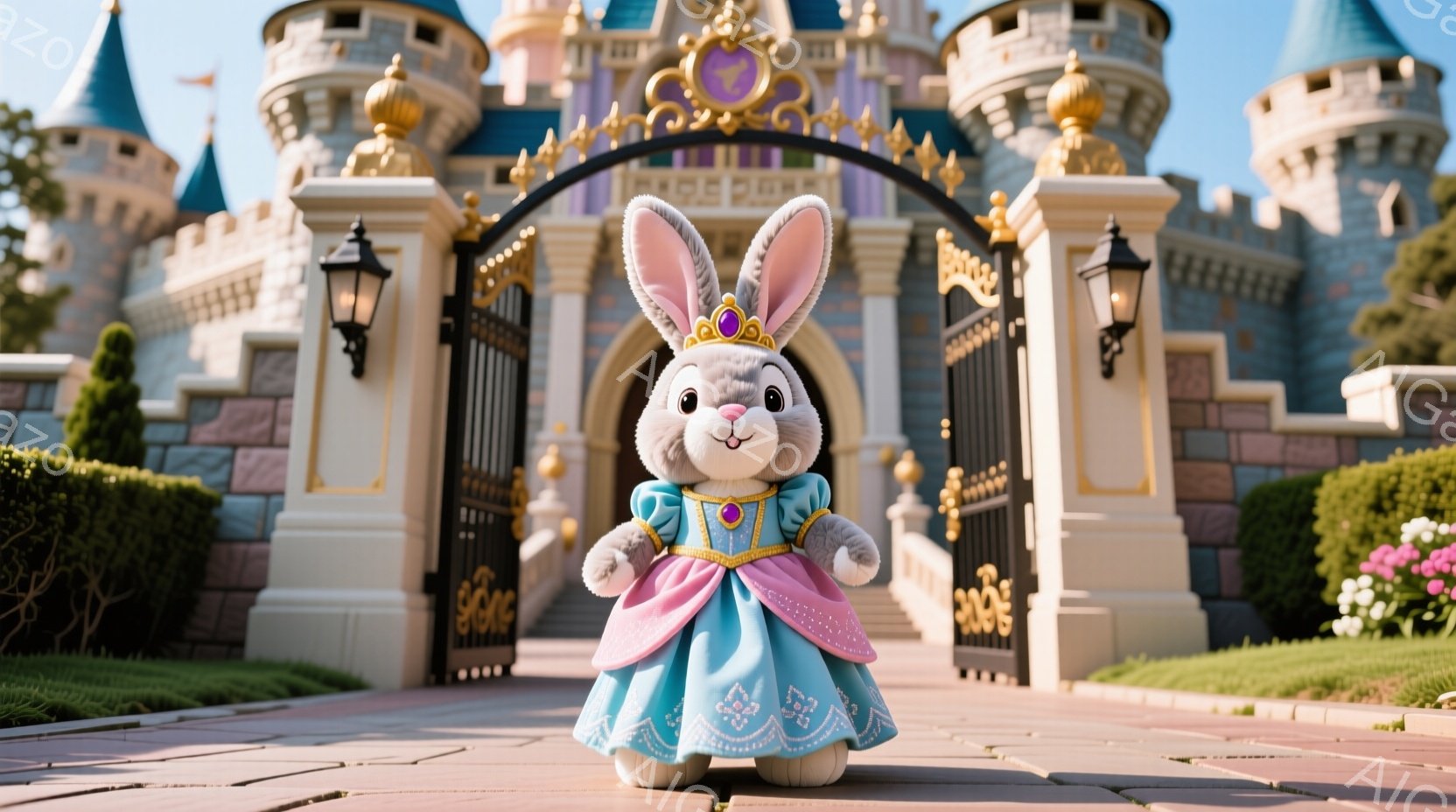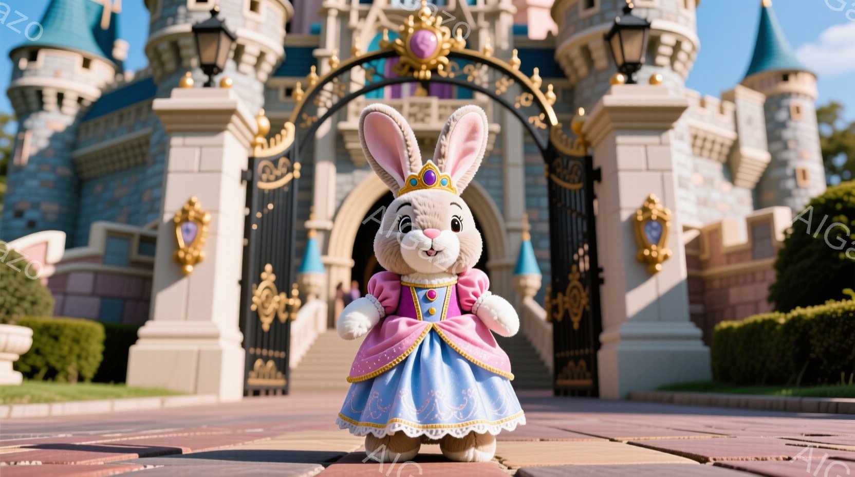 白いふわふわのウサギのぬいぐるみは、ターコイズブルーのドレスとピンクのショールを着て、可愛らしい表情で正面を見つめて立っています。背景にはシンデレラ城がそびえ立ち、緑豊かな庭園と青空が広がっています。全体的に夢のような、おとぎ話のような雰囲気です。