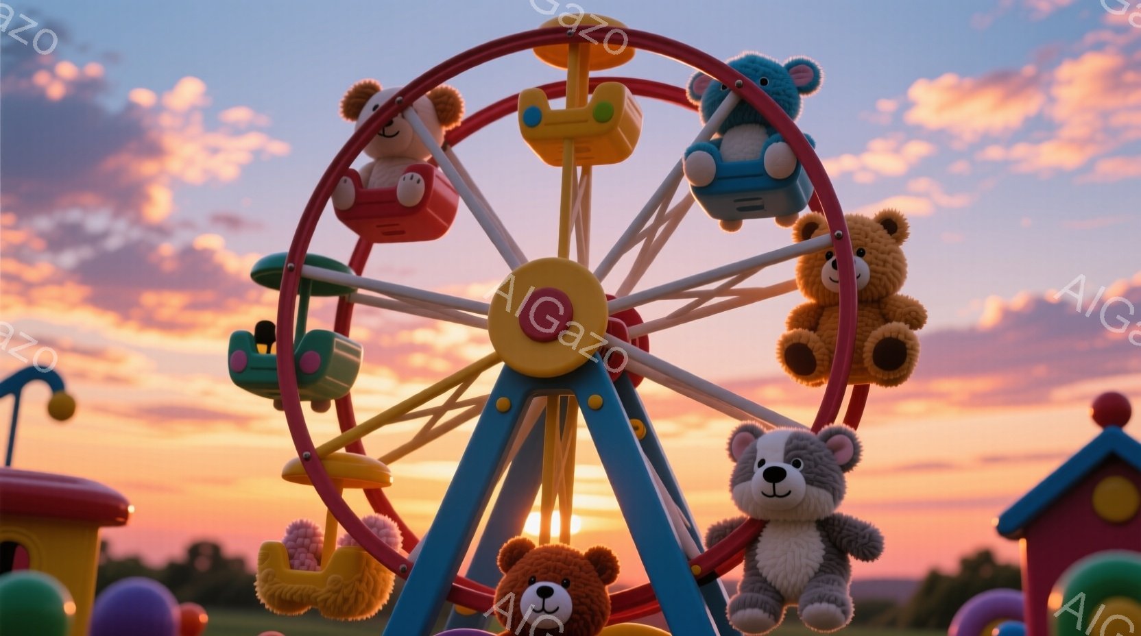 色とりどりの遊園地の観覧車に、可愛らしいテディベアたちが座っています。背景には夕焼け空が広がり、緑の草原と遠くに見える山々が穏やかな雰囲気を醸し出しています。遊園地全体が暖かく、夢のような光景です。