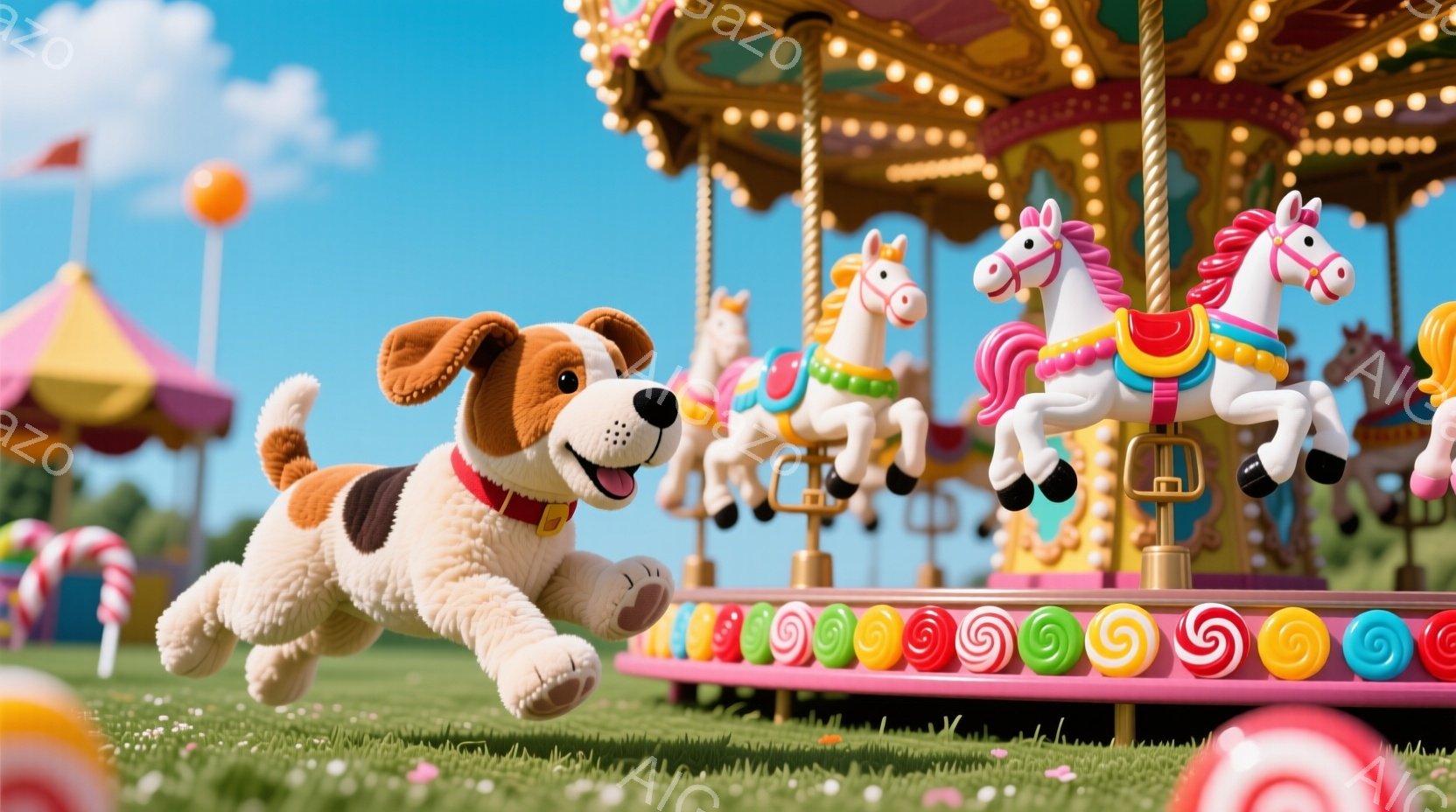 緑の芝生の上を走る、ふわふわの白い犬が描かれています。犬は赤い首輪を付けており、嬉しそうな表情で、右方向に走り、背景にはカラフルなメリーゴーランドとキャンディーが散らばっています。明るい日差しと鮮やかな色彩が、楽しいお祭り気分を演出しています。