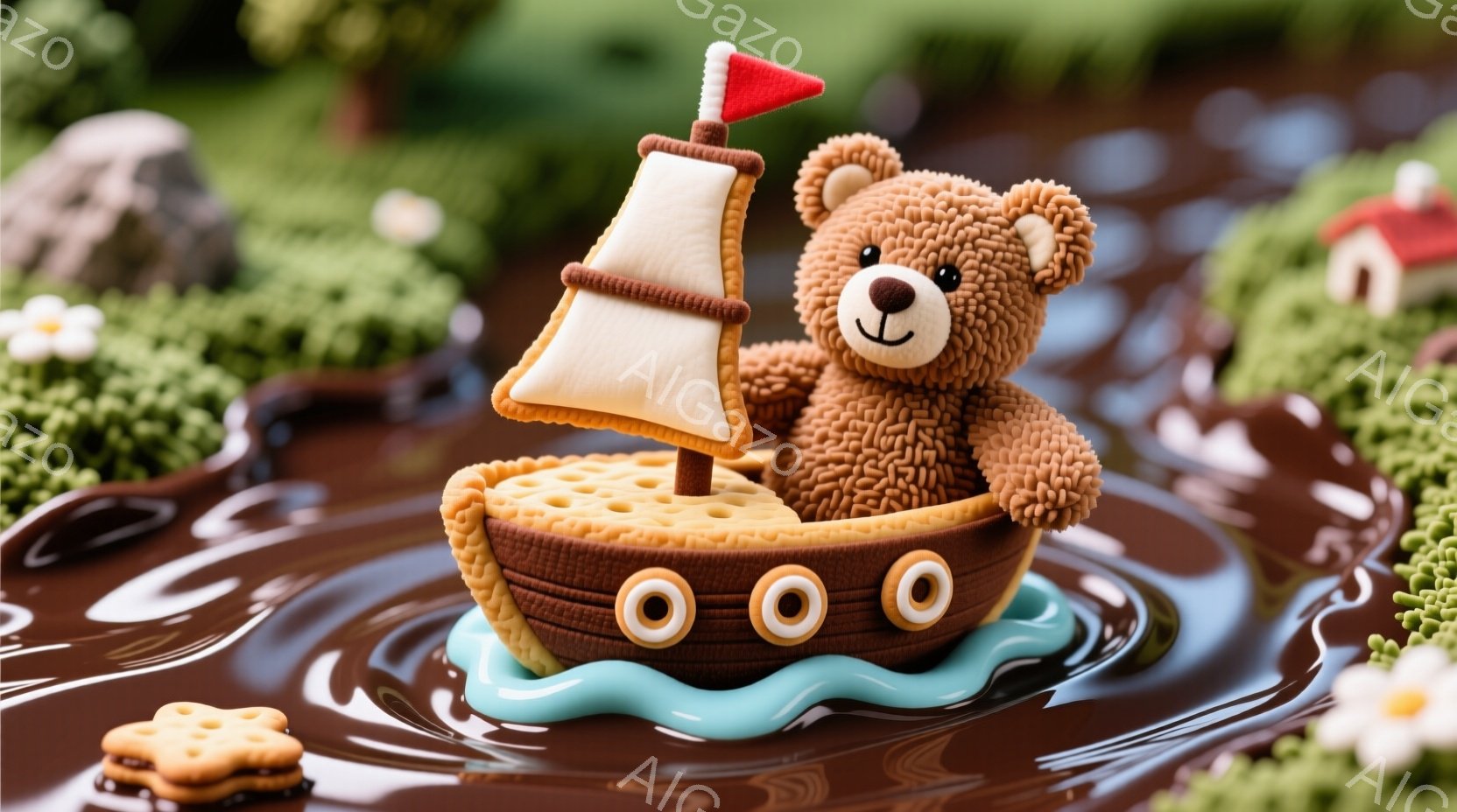 茶色のテディベアが、クッキーで作られたボートに乗って、チョコレートの海を航海している様子が描かれています。ボートはクッキーで縁取られ、ビスケットで作られた帆が付いており、背景にはチョコレートの波紋と、緑色の苔のような植物、そしてビスケットやチョコレートの破片が点在しています。全体的に甘くて夢幻的な雰囲気が漂い、お菓子の世界への冒険を連想させます。