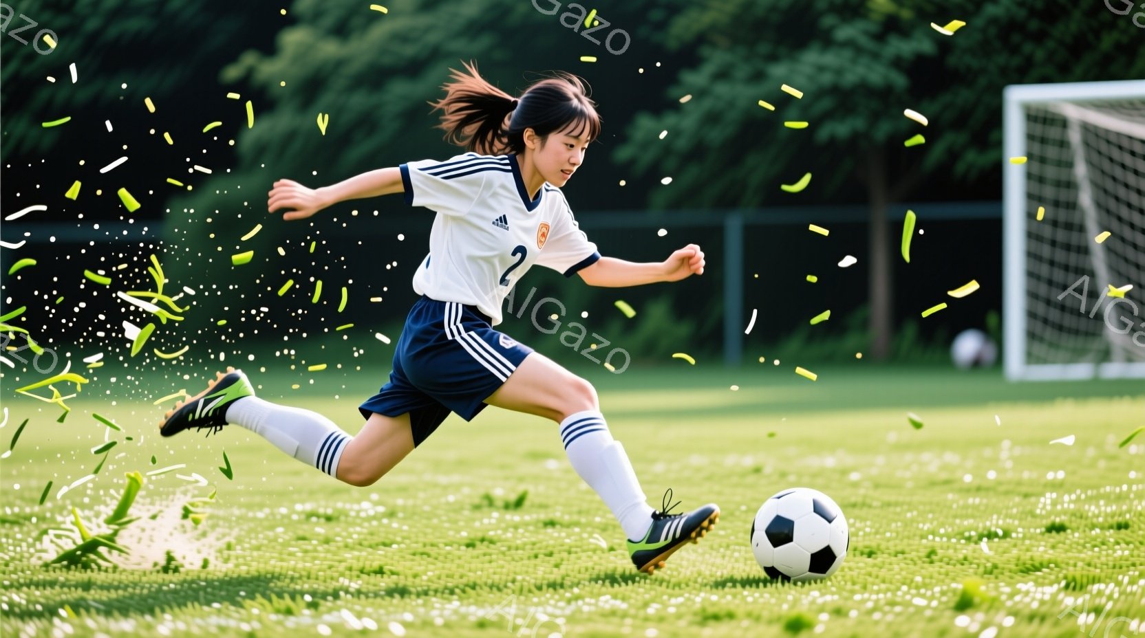少女はサッカーの試合中、芝生の上にスライディングしている様子が写っています。白い襟と黒いトリムが特徴的な白いサッカーユニフォームを着ており、髪はポニーテールに結ばれています。背景にはサッカーゴールと緑豊かな自然が見え、空中にはカラフルな紙吹雪が舞い、活気に満ちた雰囲気を醸し出しています。
