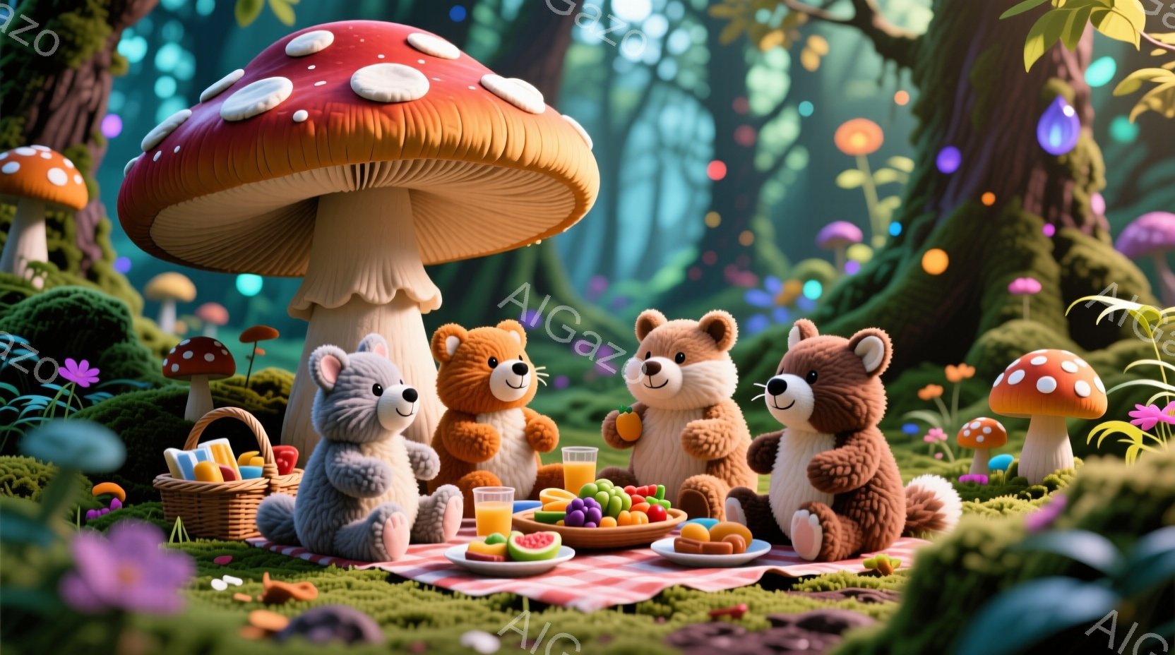 可愛らしいクマのぬいぐるみたちが、赤いチェックのブランケットの上に座ってピクニックを楽しんでいます。大きな赤いキノコや色とりどりの植物が生い茂る森の中で、彼らはオレンジジュースとケーキを囲み、幸せそうに微笑んでいます。背景には幻想的な光が差し込み、温かく穏やかな雰囲気を醸し出しています。