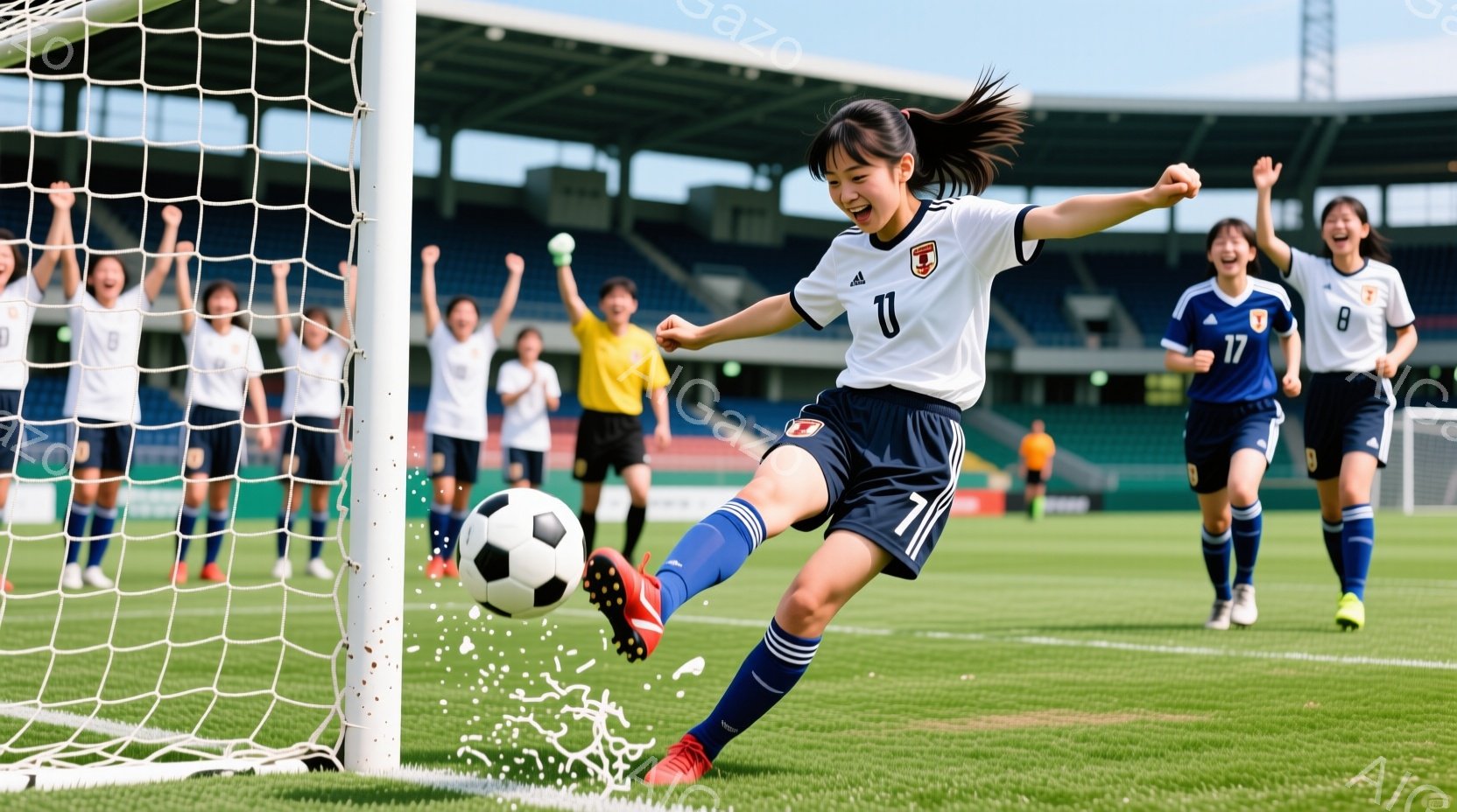 サッカーの試合中に、日本の女性選手がボールを蹴り出す瞬間を捉えた写真です。彼女は黒のユニフォームに白の番号「10」が書かれ、ポニーテールで髪をまとめています。背景には、喜びを爆発させるチームメイトと観客席が見え、勝利の瞬間を象徴する活気あふれる雰囲気が伝わってきます。