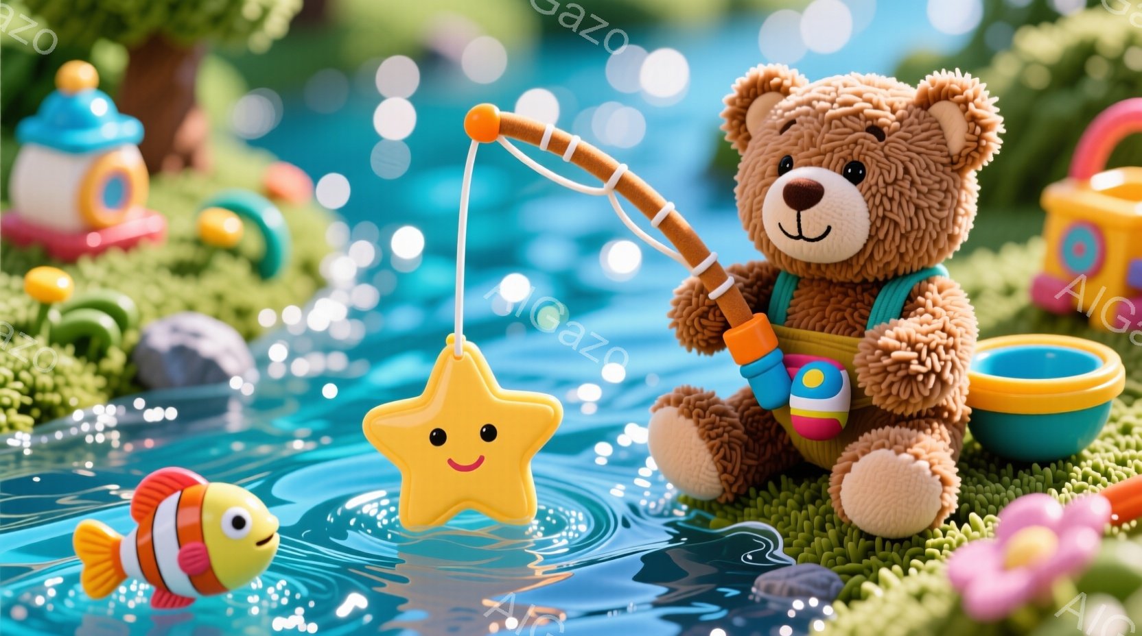 柔らかい茶色のテディベアが釣りを楽しんでいます。青いオーバーオールと赤いバケツを身につけ、顔は穏やかな笑顔で満ちています。背景には緑の草と水面、そしてカラフルな魚たちが浮かび、暖かい春の日のような平和で楽しい雰囲気が漂っています。