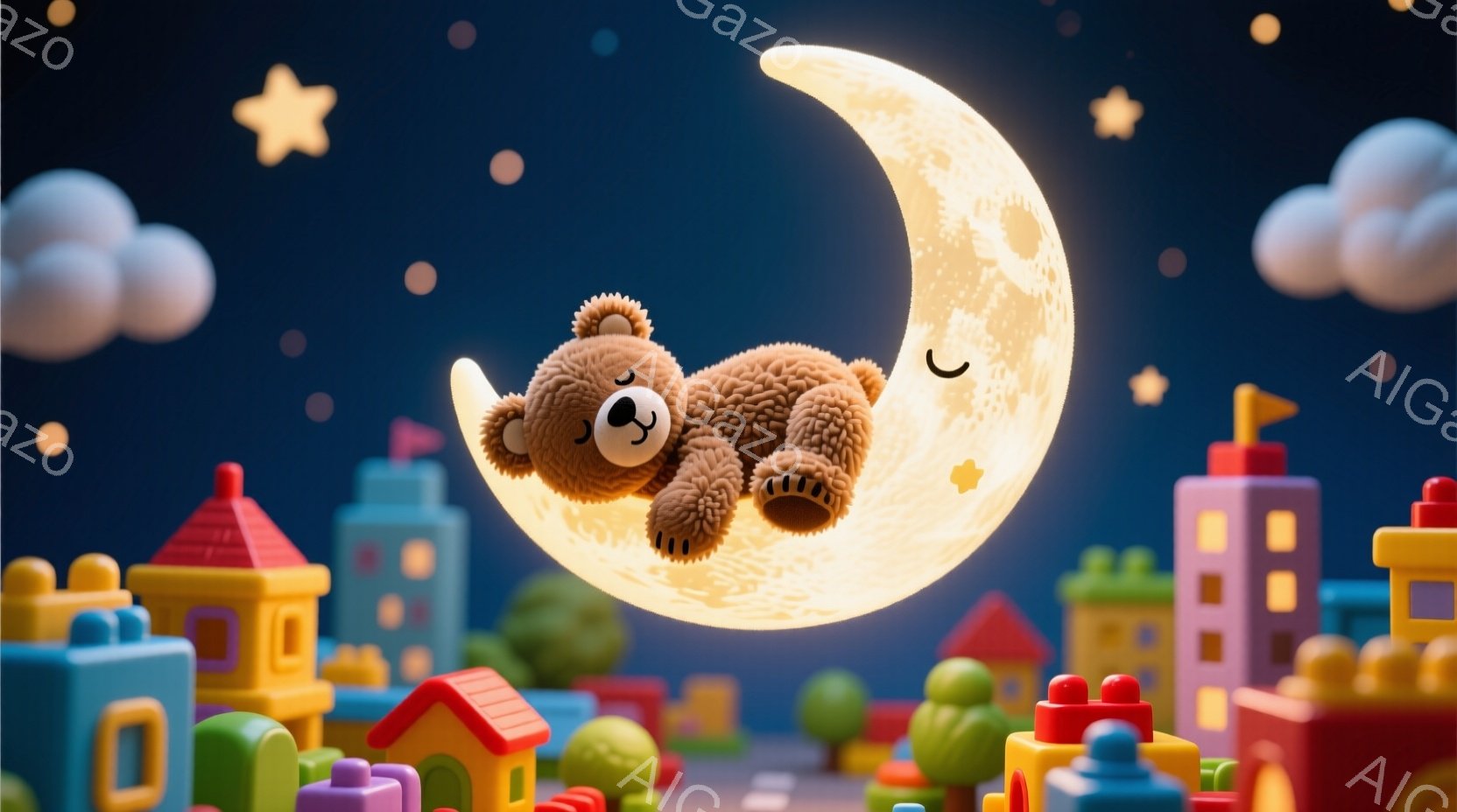 柔らかい茶色のテディベアが、明るい満月の上で眠っています。背景には、カラフルなブロックで作られたおもちゃのような街並みが広がり、星空が夜空を彩っています。全体的に温かく、夢のような雰囲気が漂い、子供向けの可愛らしいイラストレーションです。