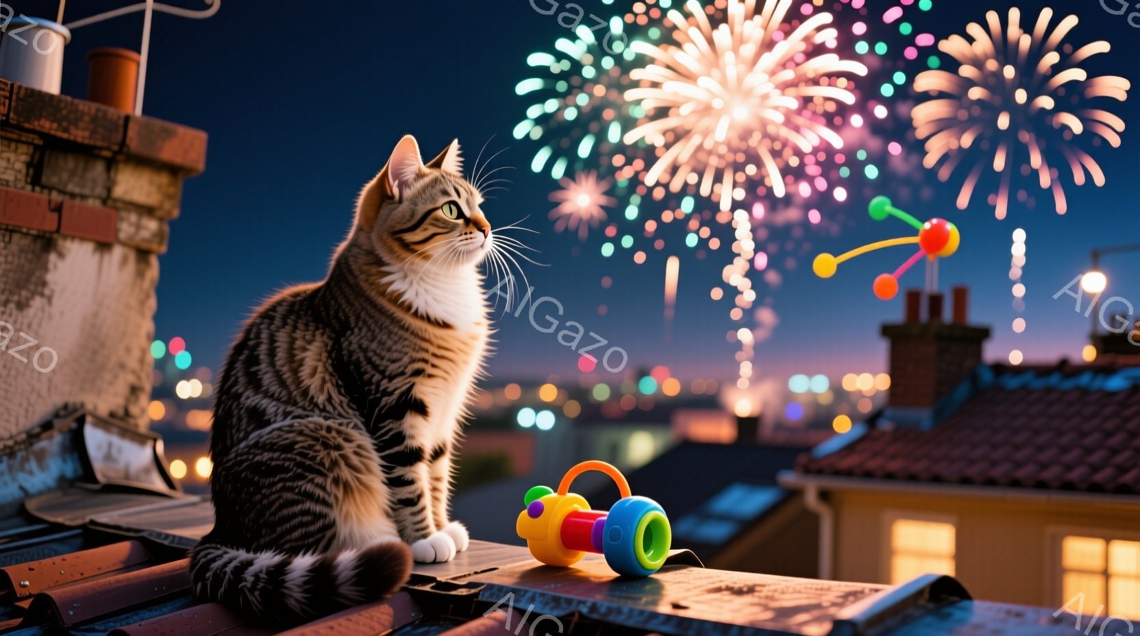 茶トラの猫が、瓦屋根の上に座って、遠くの花火を見上げています。猫はリラックスした表情で、好奇心と少しの驚きが混ざったような顔をしています。背景には、夜景が広がり、建物が密集しており、花火が夜空を彩り、華やかな雰囲気を醸し出しています。