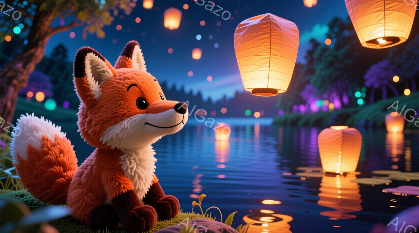鮮やかなオレンジ色のキツネが、苔むした岩の上に座って、空に浮かぶ提灯を見上げています。キツネは丸い目と優しい笑顔で、リラックスした雰囲気です。背景には、暗い森と水面が広がり、提灯の光が水面に反射して幻想的な光景を作り出しています。