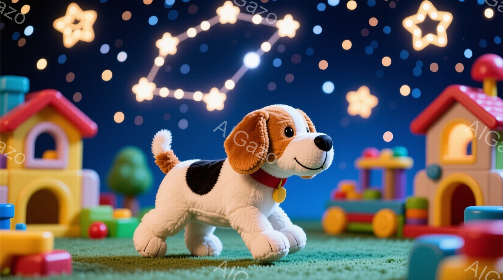 ぬいぐるみ犬が緑色の芝生の上に立っており、赤い首輪を付けて前を見据えています。背景には、カラフルなプラスチックのおもちゃの家や車が散りばめられており、上空には星のような光が輝いています。全体的に、温かく、遊び心に満ちた雰囲気で、子供向けの楽しい空間を表現しています。