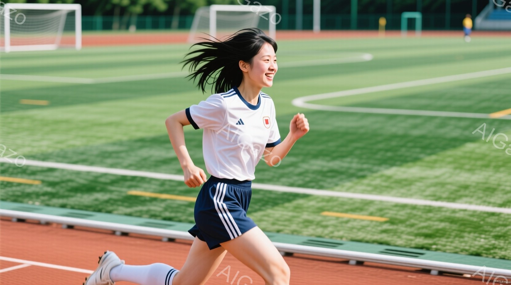 短い黒髪をなびかせ、白いトリムの入ったスポーツウェアを着た若い女性が、緑の芝生のあるトラックを走っている。彼女は笑顔で、走りながら前を見つめている。背景にはサッカーゴールと緑豊かな木々が見え、晴れた日の爽やかな雰囲気を醸し出している。
